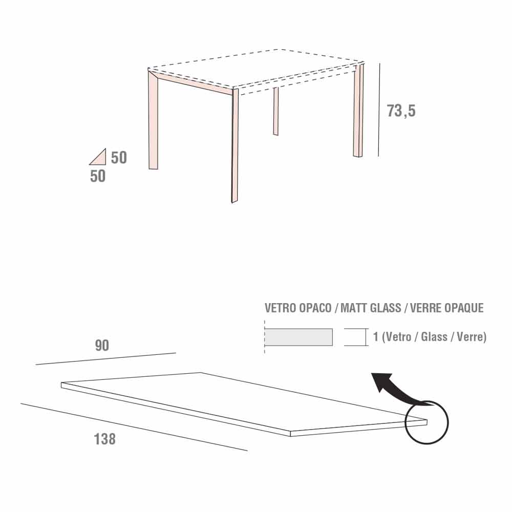Tavolo da pranzo in vetro opaco con struttura in metallo Made in Italy.