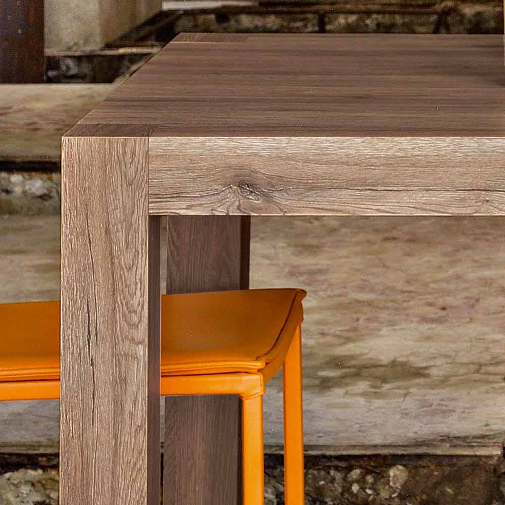Il tavolo da pranzo Oky è realizzato in melaminico con finitura oak natura. Dispone di 4 pratiche allunghe da 40 cm ciascuna che consentono di estendere il tavolo fino a raggiungere una superficie di 320 cm, tramite un pratico e veloce sistema di allungamento su binari scorrevoli.