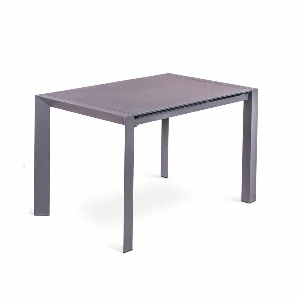 Tavolo con struttura in metallo verniciato e top in vetro acidato, con 1 allunga da 50 cm.