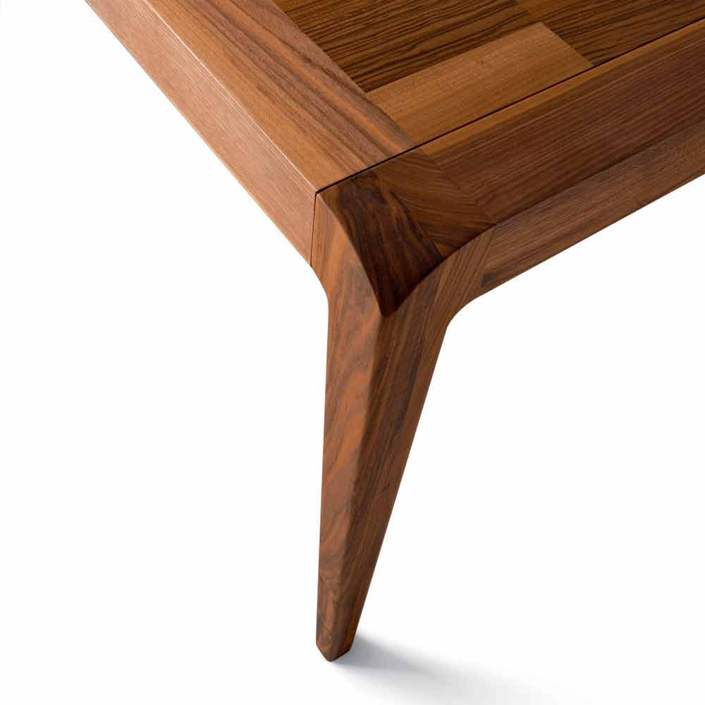 Tavolo rettangolare allungabile con piano lastronato noce naturale con intarsio. Struttura e gambe in massello di noce. Allunghe con fasce sottopiano. Il tavolo si mette in evidenza per l'accurata lavorazione del piano, un intarsio contemporaneo che ben si sposa con il movimento curvo delle gambe che non creano angoli.