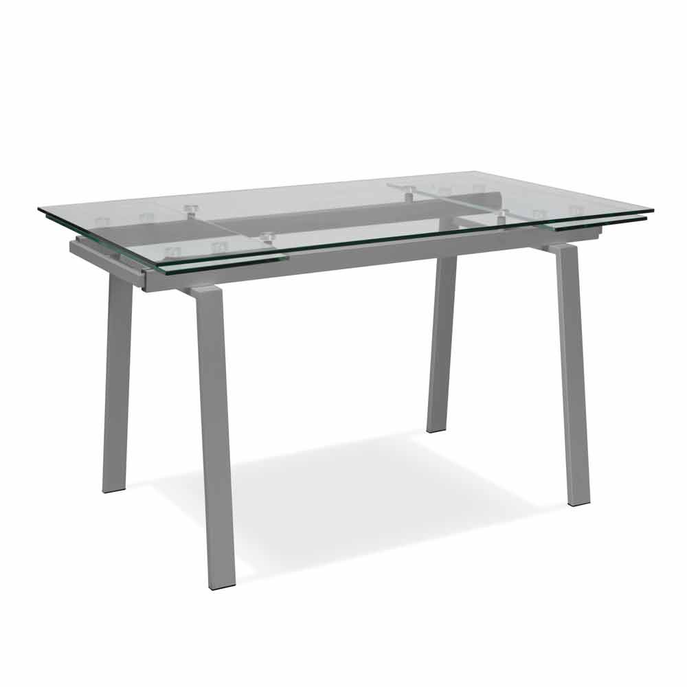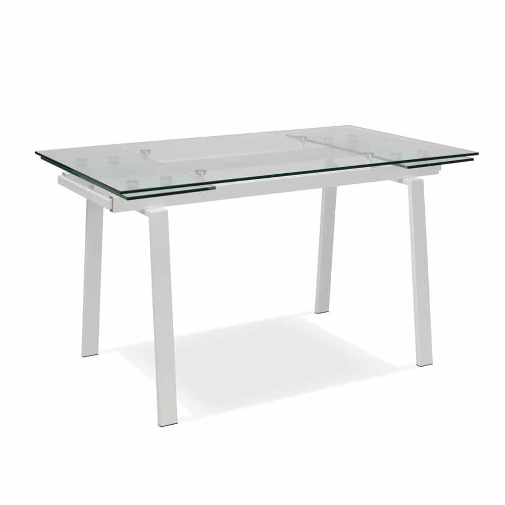 Tavolo di design allungabile con base in metallo verniciato. Top e allunghe in vetro trasparente temperato.