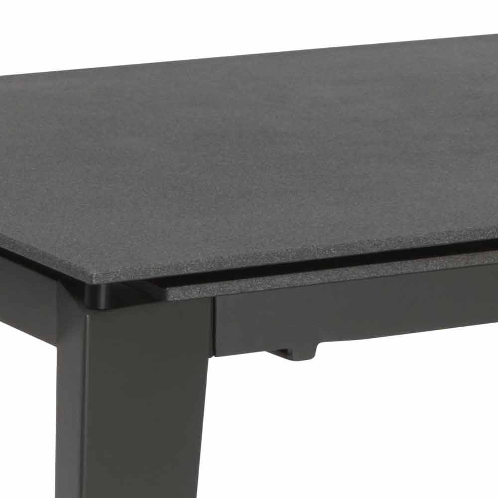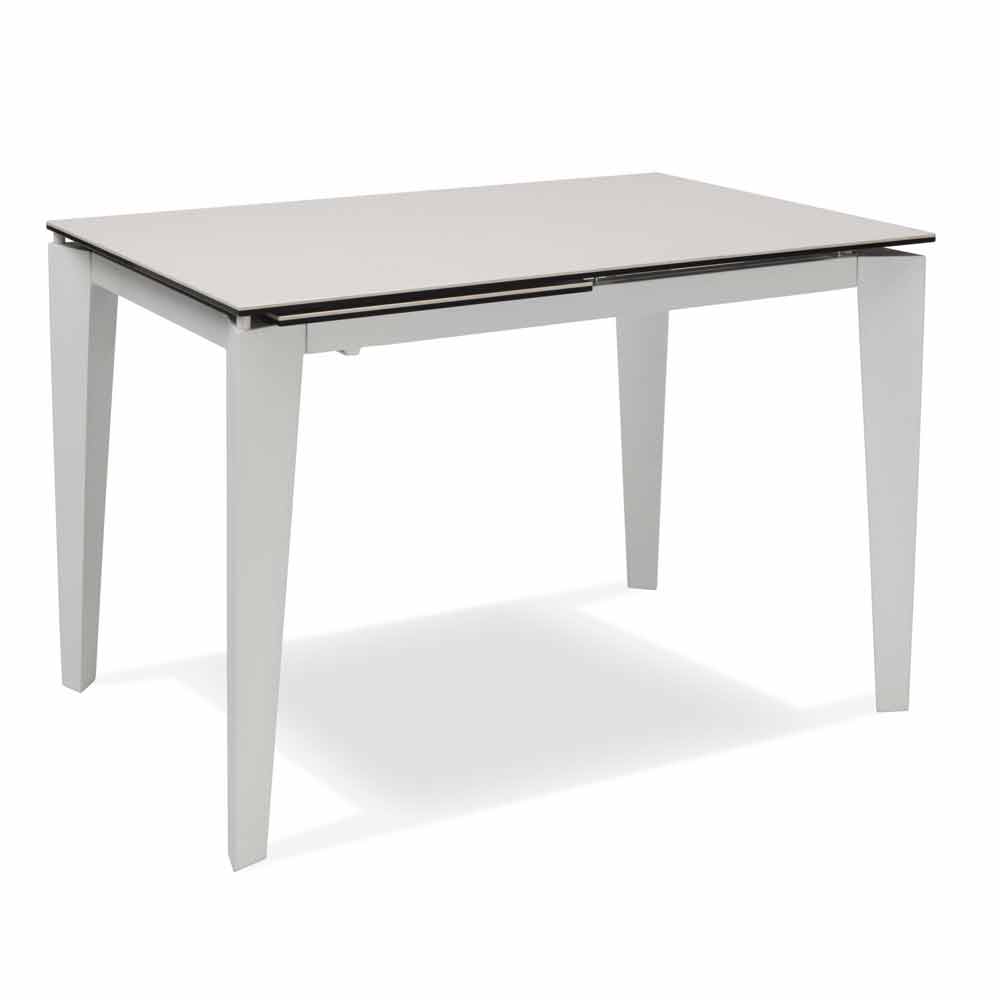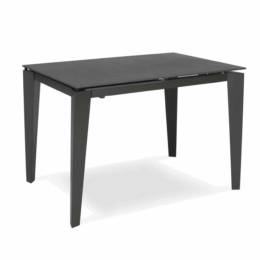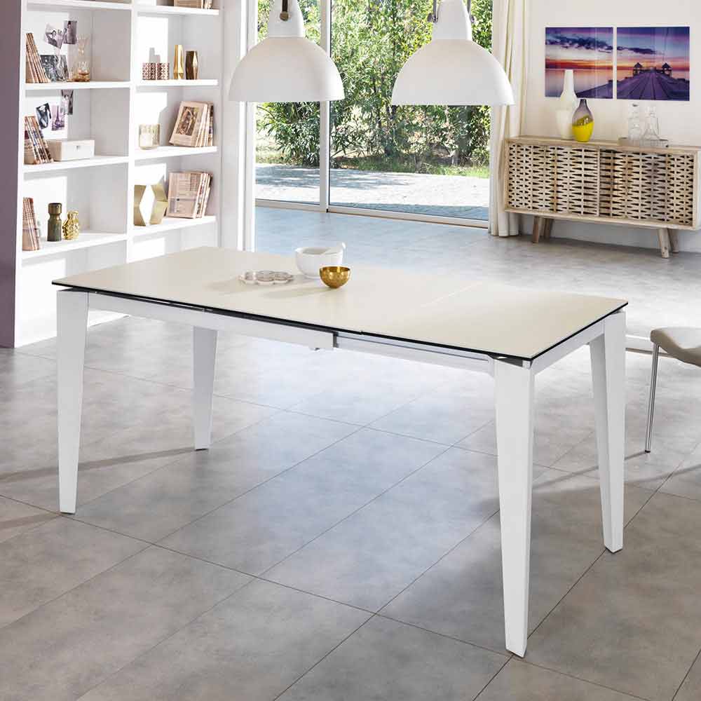 Tavolo rettangolare allungabile con base in metallo verniciato opaco. Top e allunga in vetro e ceramica ( strato inferiore in vetro, strato superiore in ceramica). Grazie alla pratica allunga, è possibile estendere il tavolo fino a raggiungere una lunghezza di 170 cm.