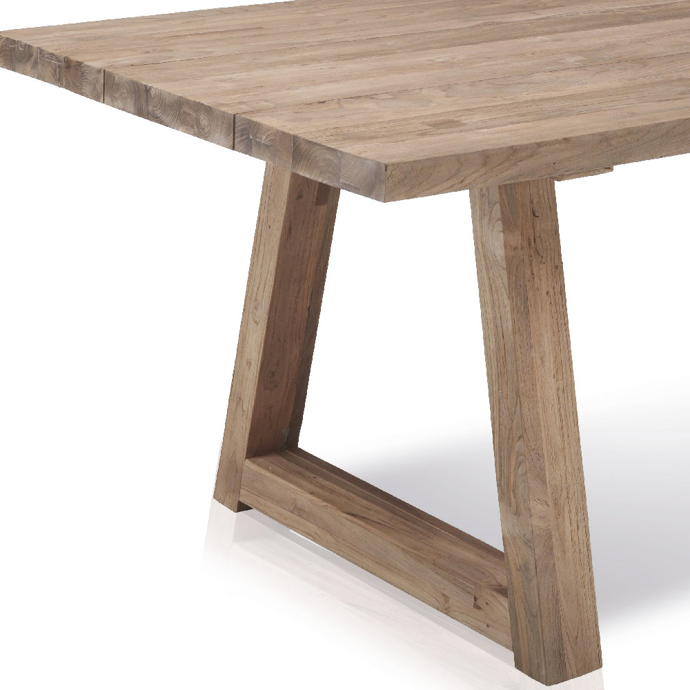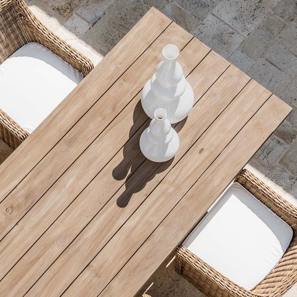 Tavolo da pranzo da giardino realizzato con legno teck reciclato interamente realizzato in Italia. Questo tavolo si presta a qualsiasi ambiente outdoor, dall'area living, al pranzo e al bordo piscina grazie al materiale usato per la realizzazione che resiste agli agenti atmosferici. Le sue finitue semplici e lineari rendono il tavolo un'idea originale per tutti coloro che vogliono arredare con gusto e stile il loro spazio esterno, senza rinunciare alla funzionalità e alla praticità.