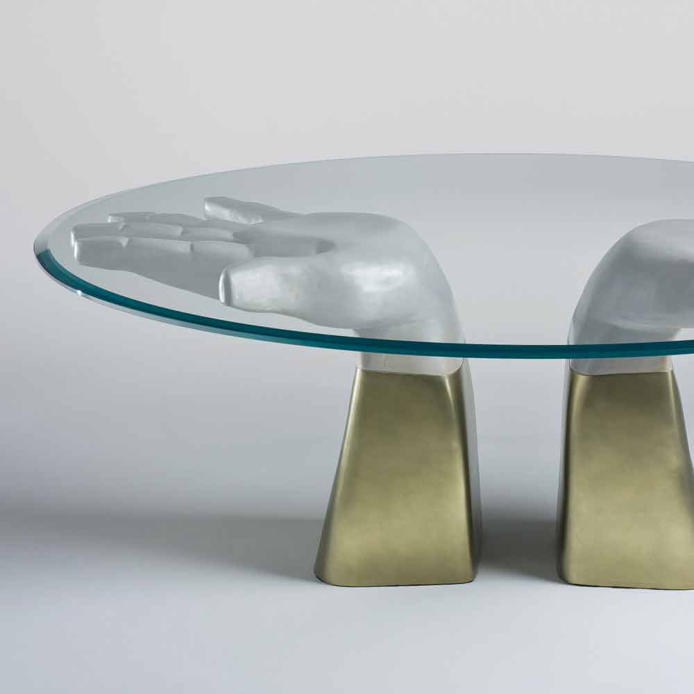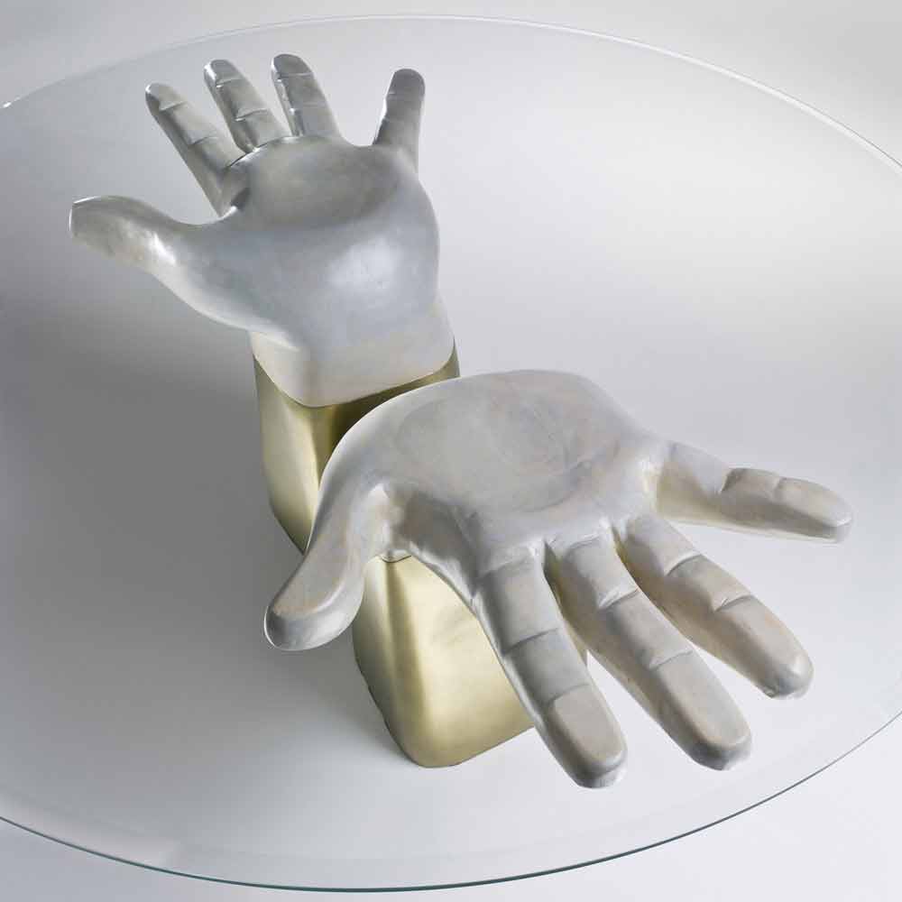 Struttura e ornamento si esaltano a vicenda: il piano rotondo è infatti sorretto dai palmi di due mani, enormi arti in legno intagliati a mano con polsini dorati che richiamano alla mente suggestioni pop. Il piano è realizzato in vetro bisellato.