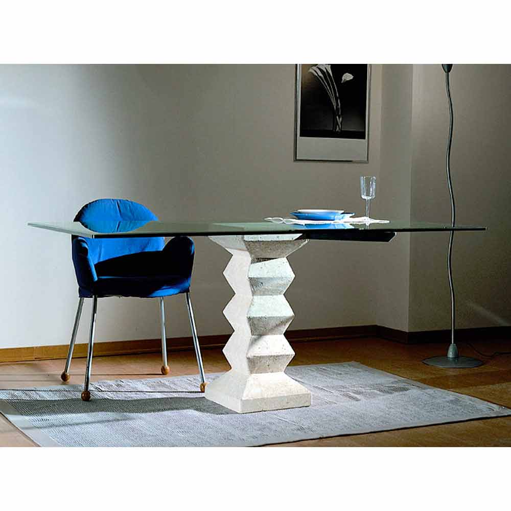 Tavolo da pranzo moderno rettangolare Made in Italy con basamento centrale in pietra naturale di Vicenza, scolpito manualmente dal blocco massello e con piano in cristallo float dallo spessore di 15 mm, supportato da una barra in metallo grezzo spazzolato e verniciato.