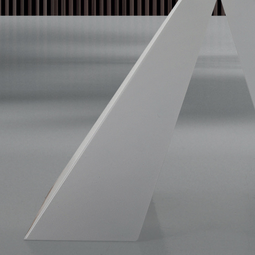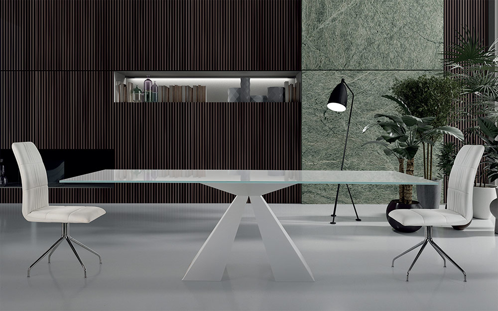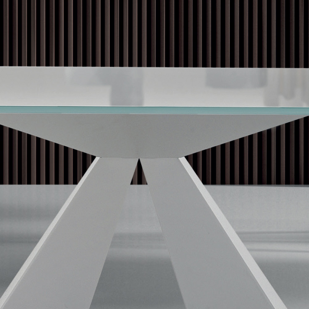 Tavolo rettangolare moderno prodotto artigianalmente in Italia in vetro temperato e base in acciaio bianco.