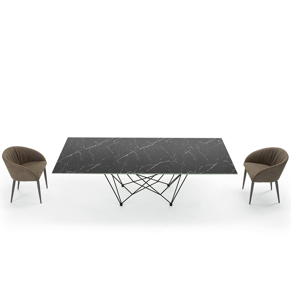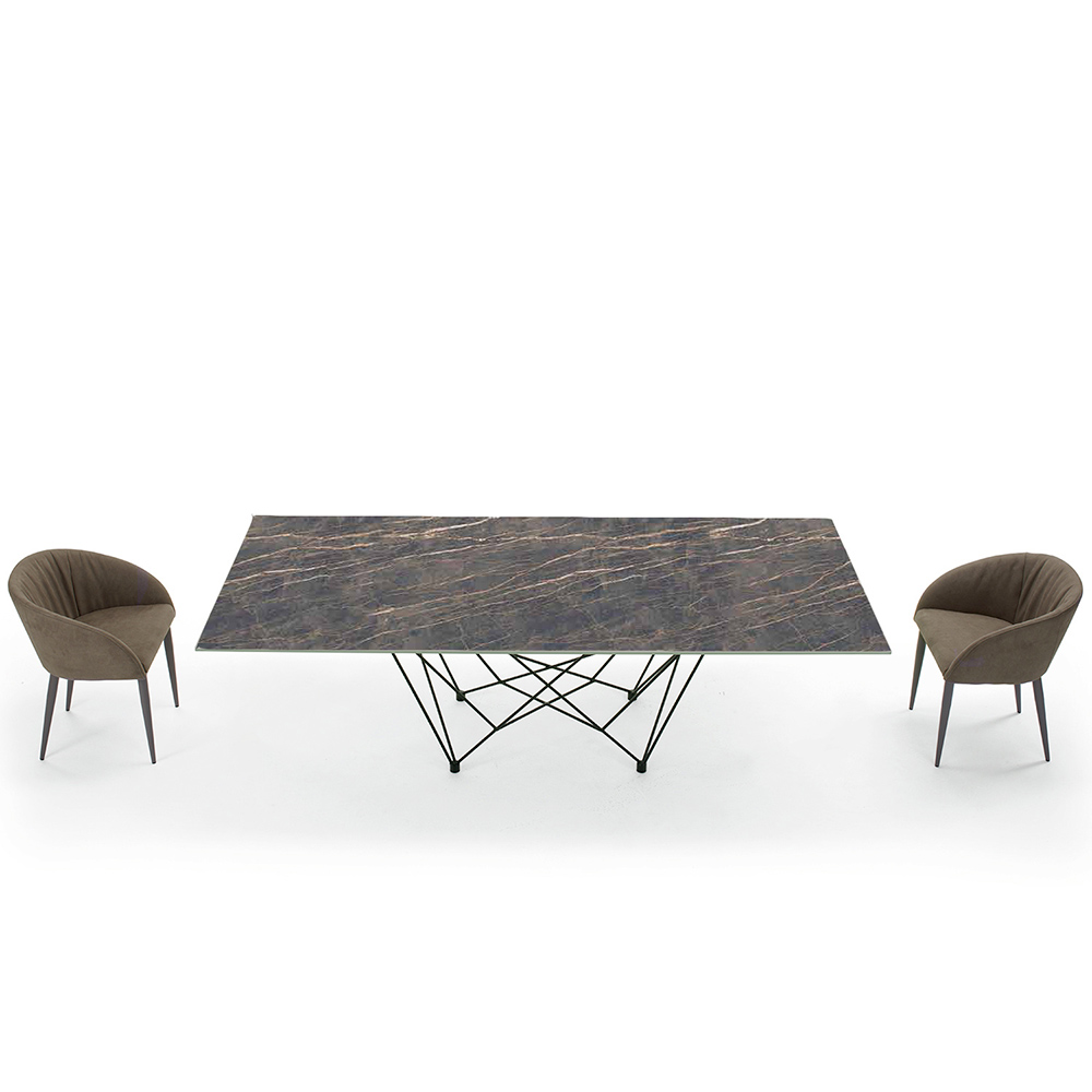 Tavolo da cucina moderno con piano in Laminam e base in acciaio nero prodotto in Italia.