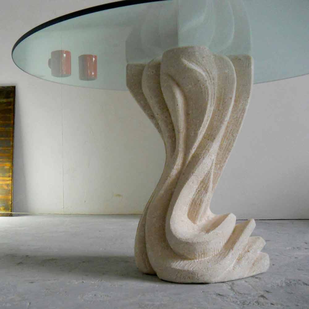 Tavolo da pranzo moderno rotondo Made in Italy con basamento centrale in pietra naturale di Vicenza, scolpito manualmente dal blocco massello e con piano in cristallo float dallo spessore di 15 mm, fissato alla base da una flangia in acciaio.