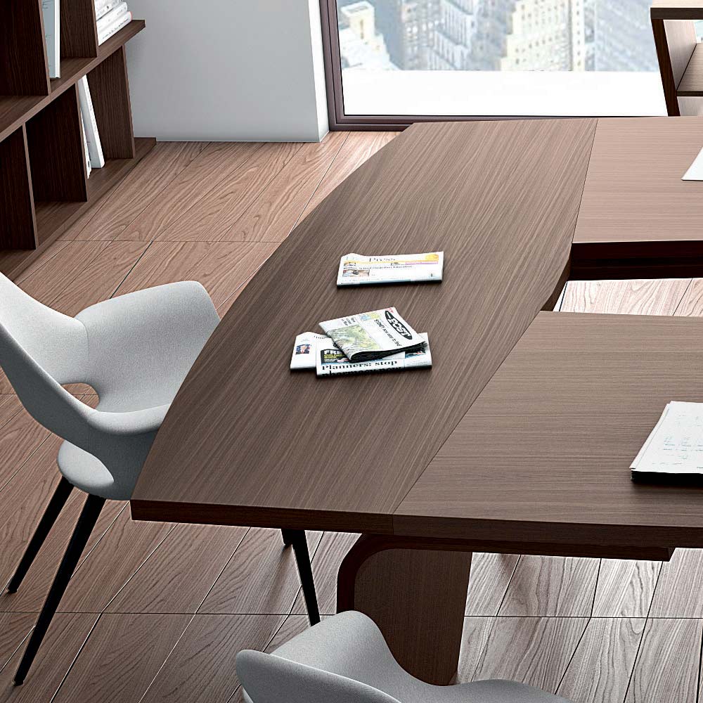 Il piano è costituito da due piane sagomate e due allunghe le quali vanno a chiudere il perimetro del piano, creando un imponente ed elegante tavolo da riunioni.