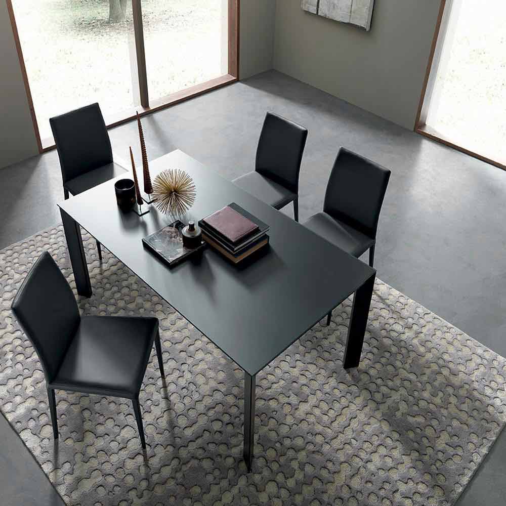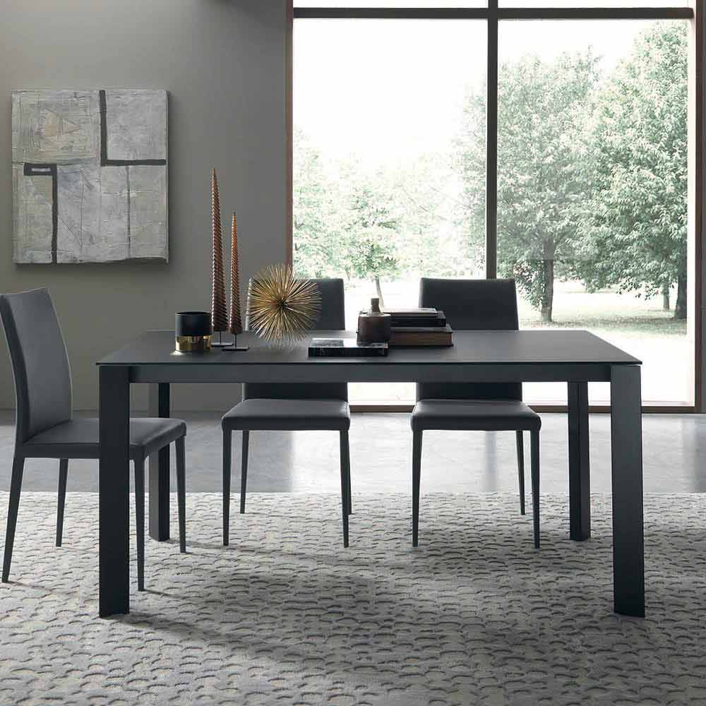 Tavolo da pranzo moderno allungabile con piano in vetro e gambe in metallo Made in Italy.