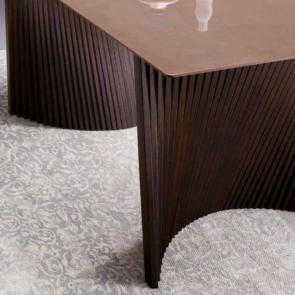 Tavolo per sala da pranzo con piano in gres e gambe in legno di frassino, prodotto di lusso Made in Italy.