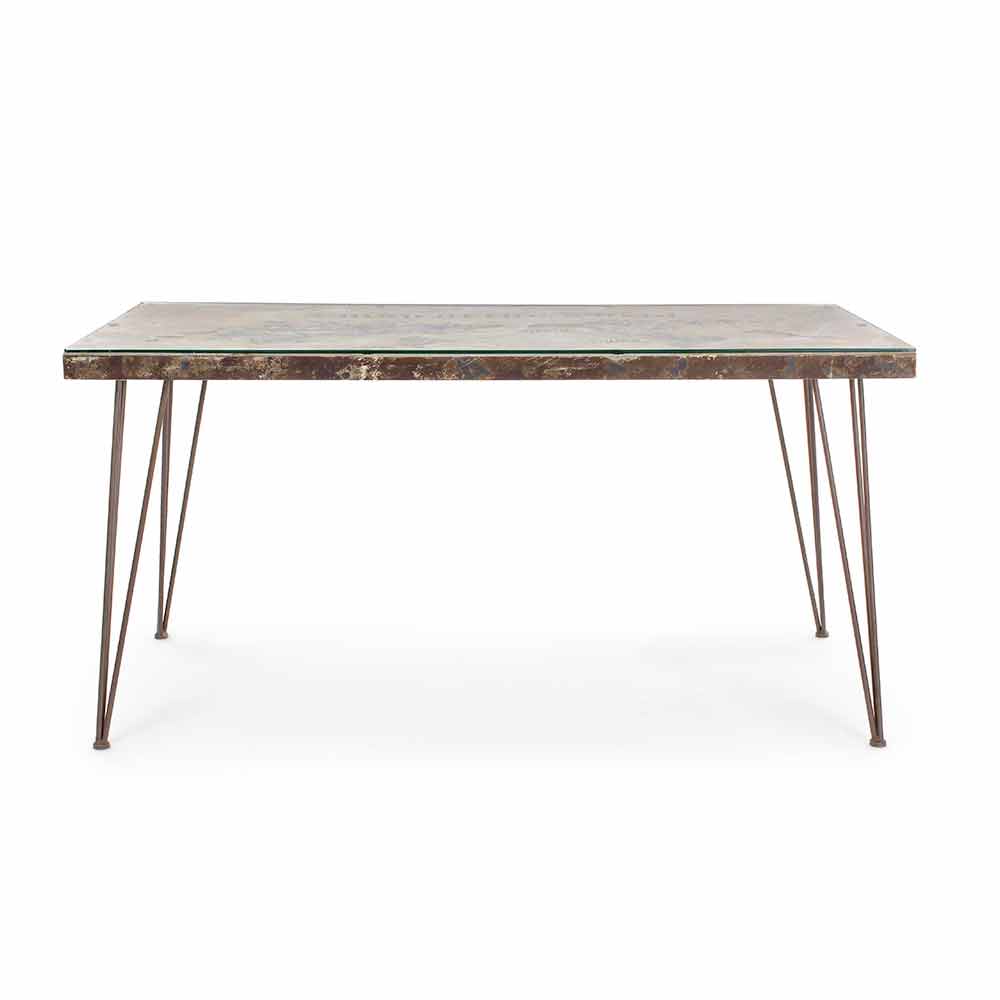 Tavolo da pranzo in stile industrial con piano in mdf e vetro e base in acciaio.