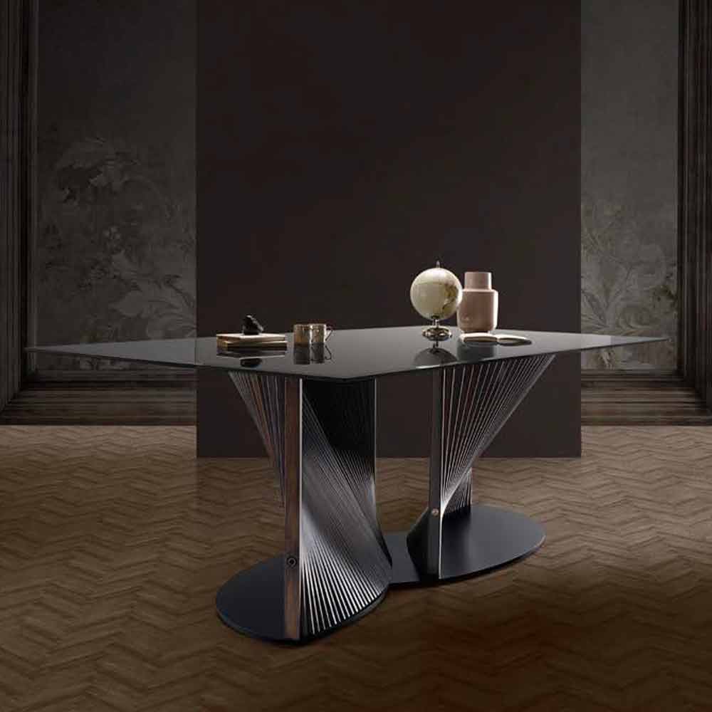 Tavolo da pranzo design elegante realizzato in vetro fumè e legno, alta qualità Made in Italy.
