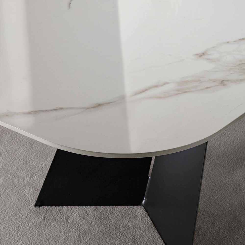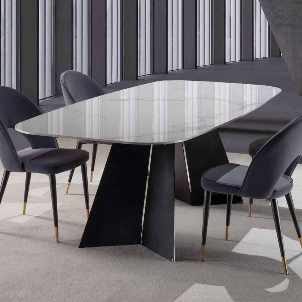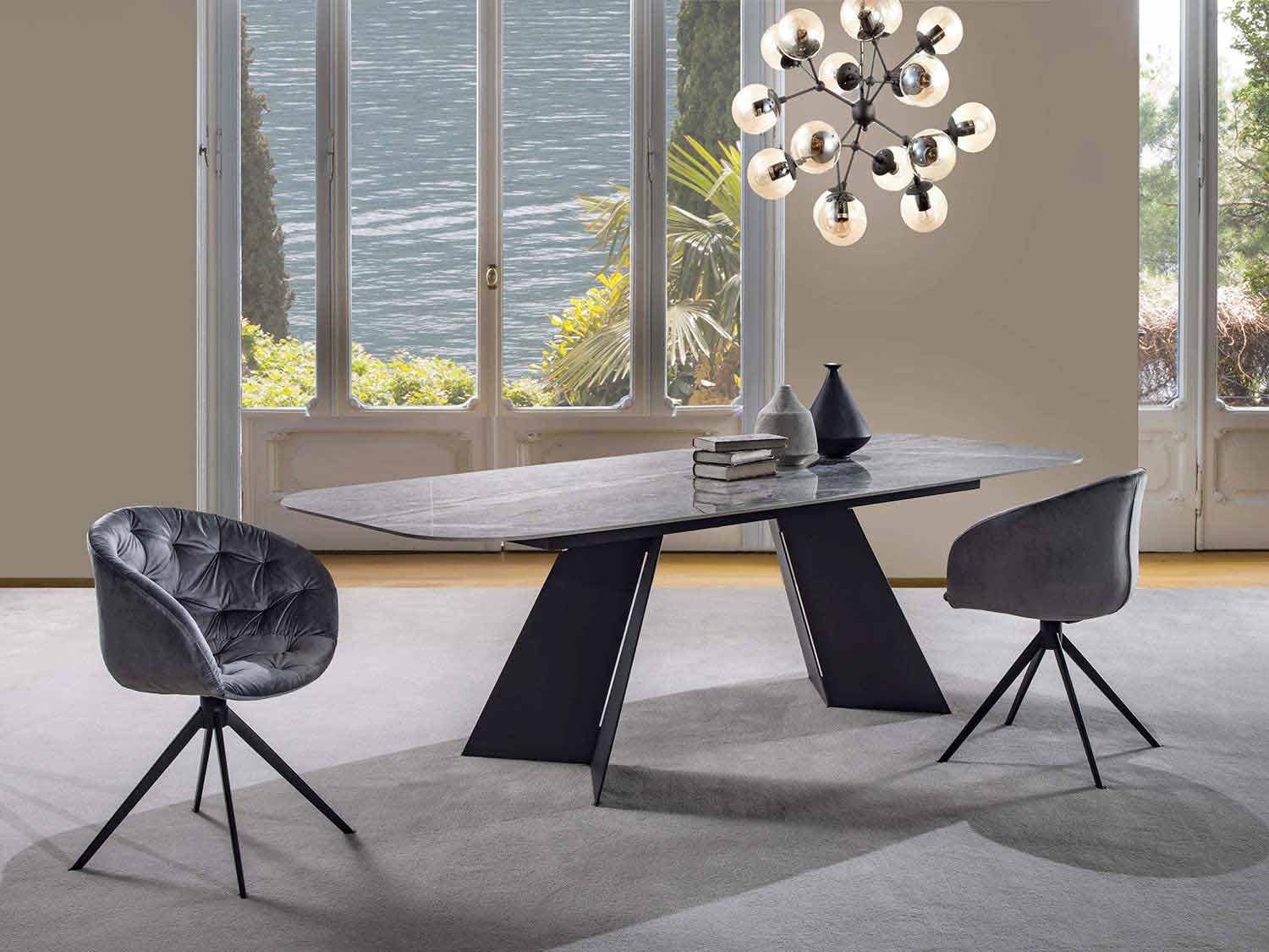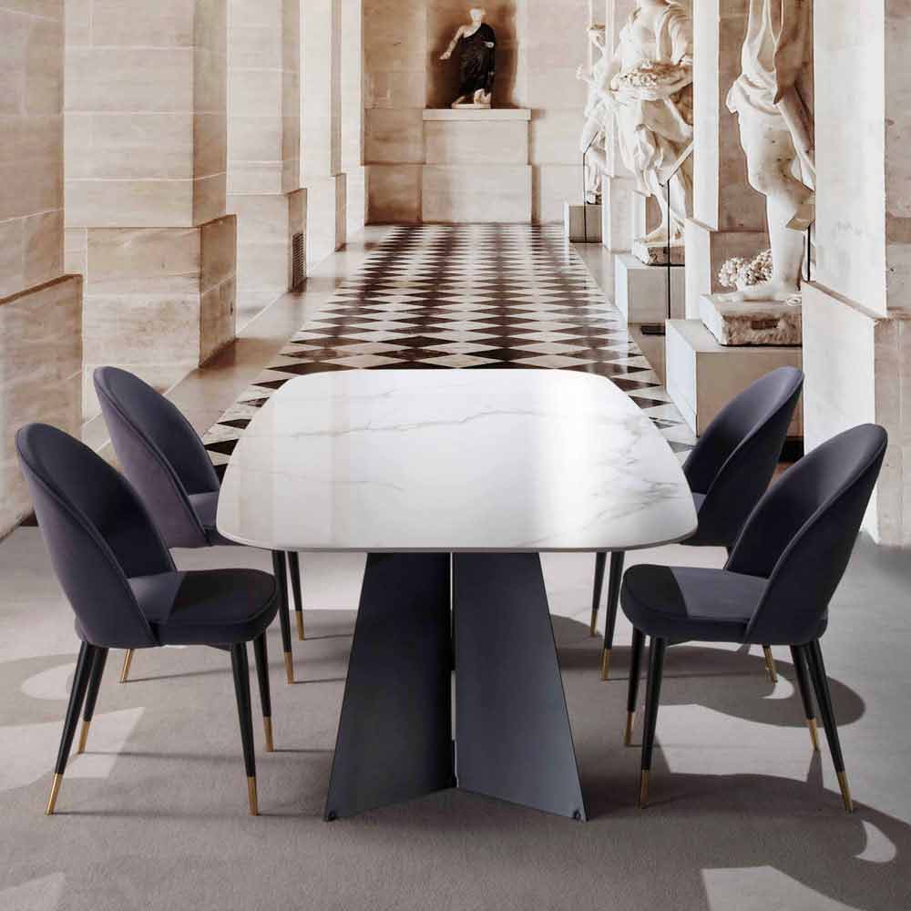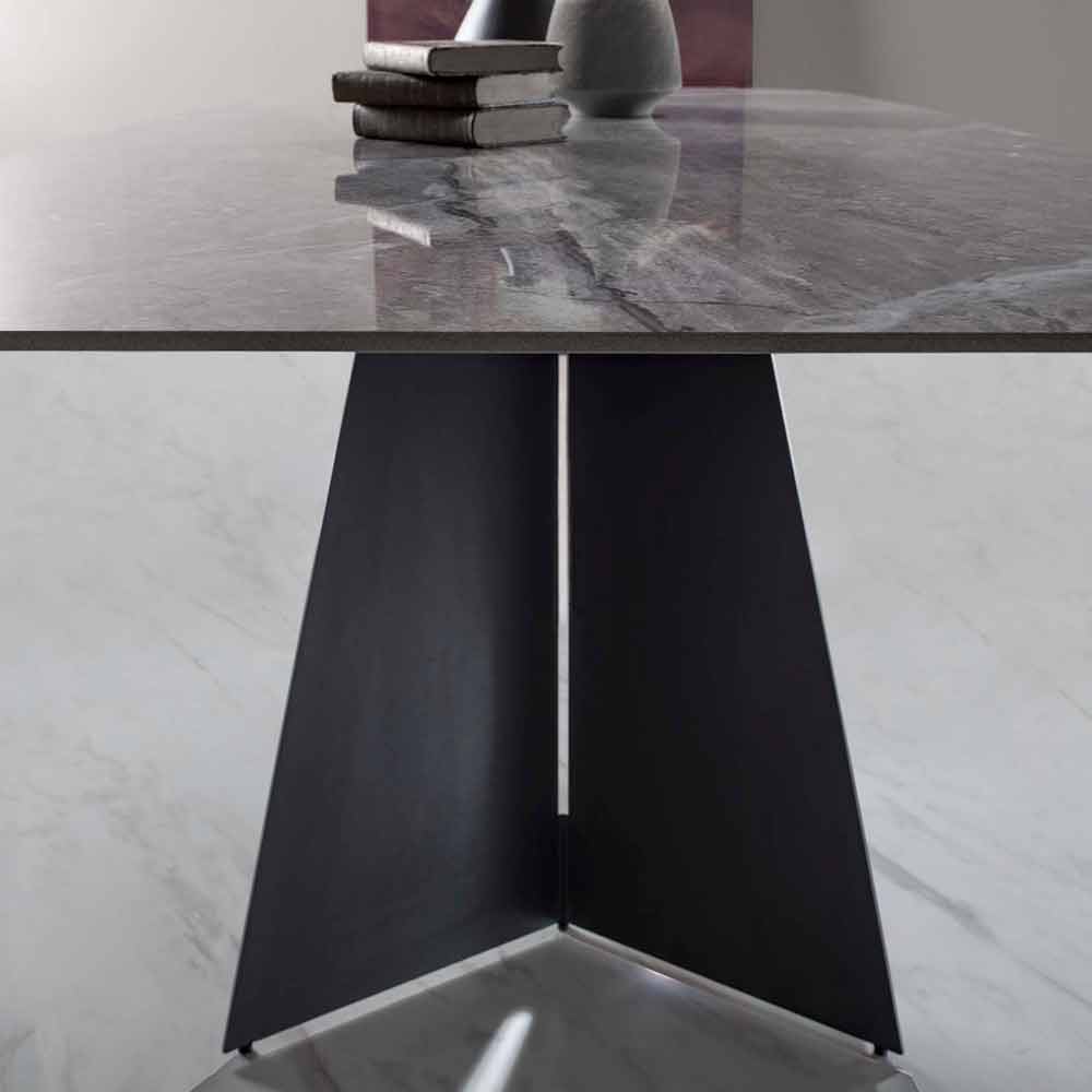 Tavolo da pranzo in acciaio con piano in gres porcellanato.