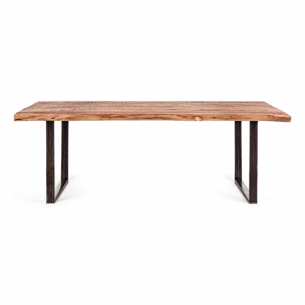 Tavolo da pranzo stile industrial con piano in legno di acacia e base in acciaio.