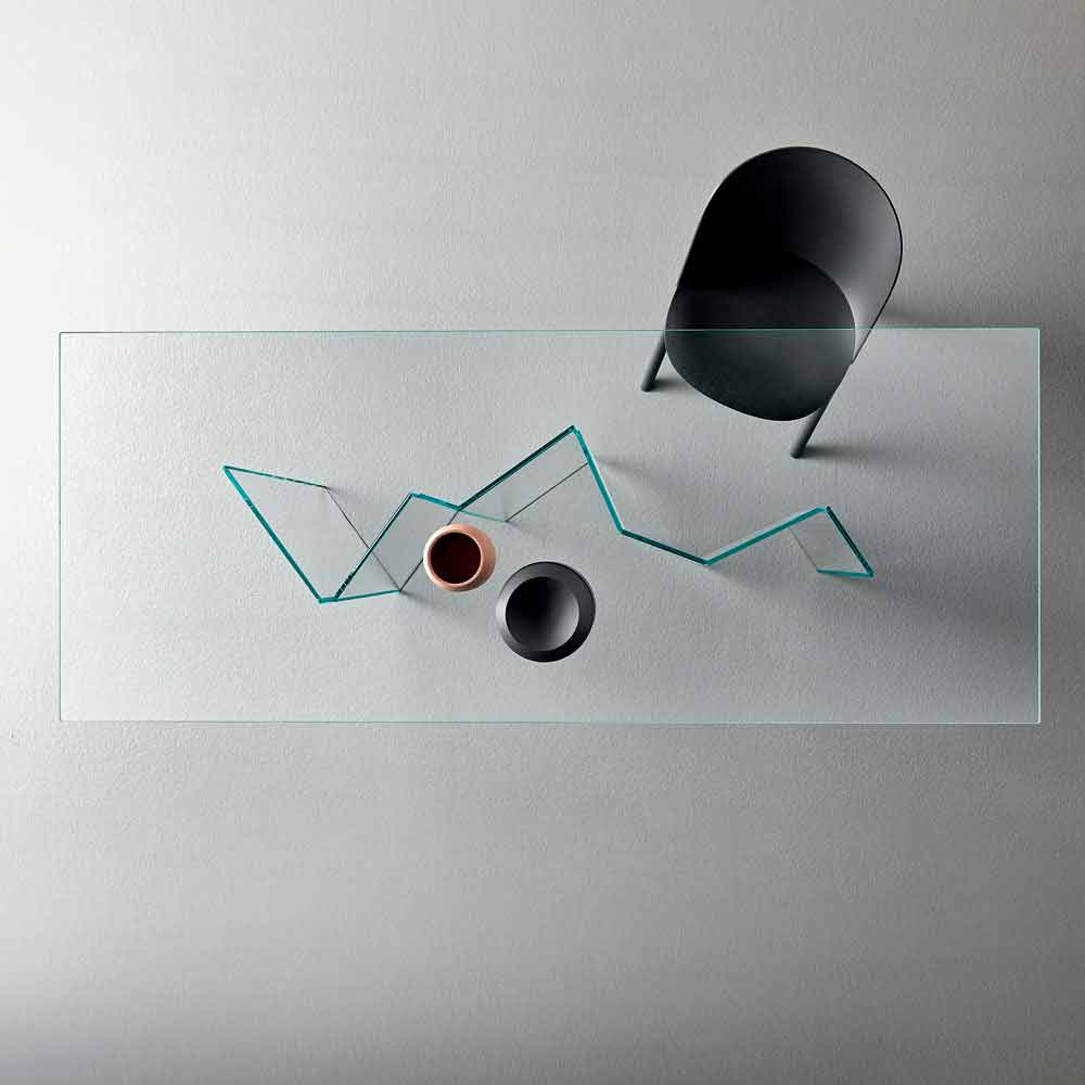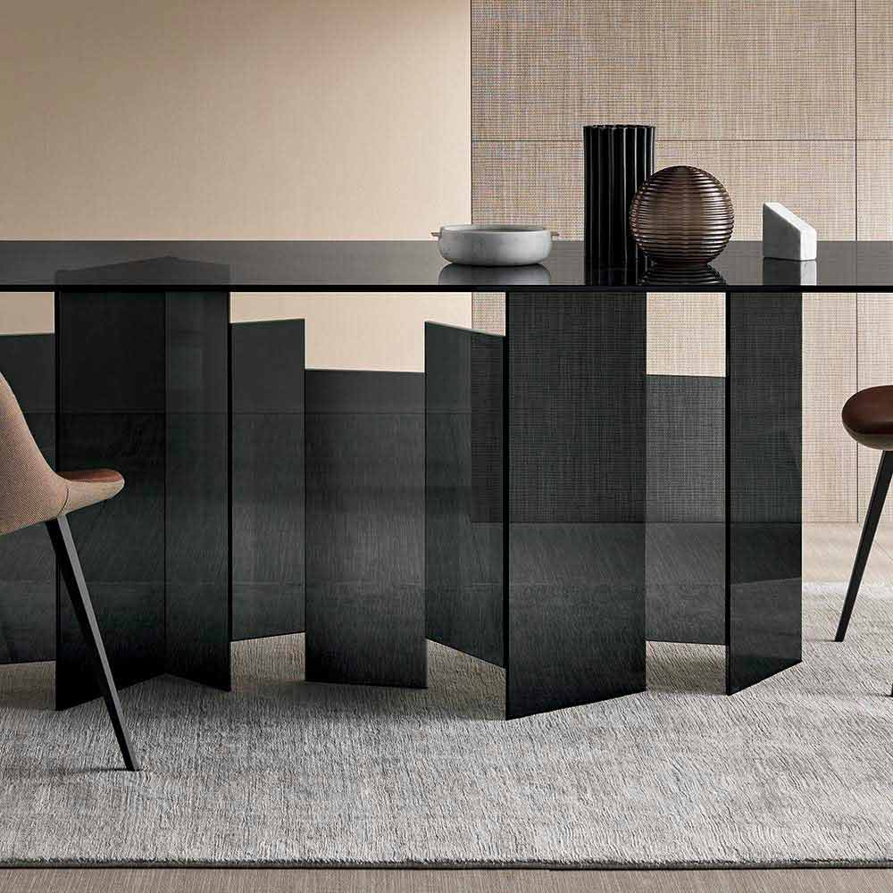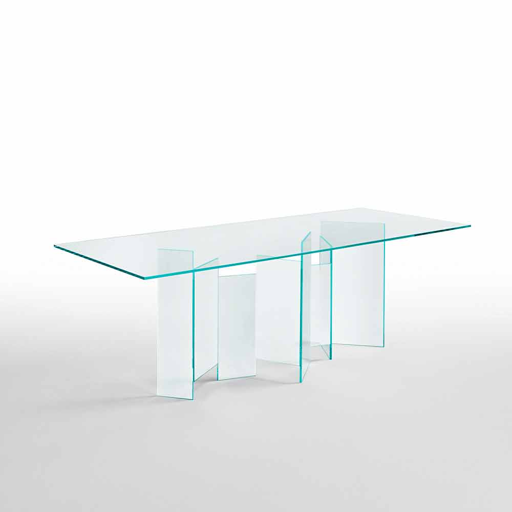 Tavolo da pranzo di design moderno in vetro extrachiaro o fumè, prodotto in Italia.
