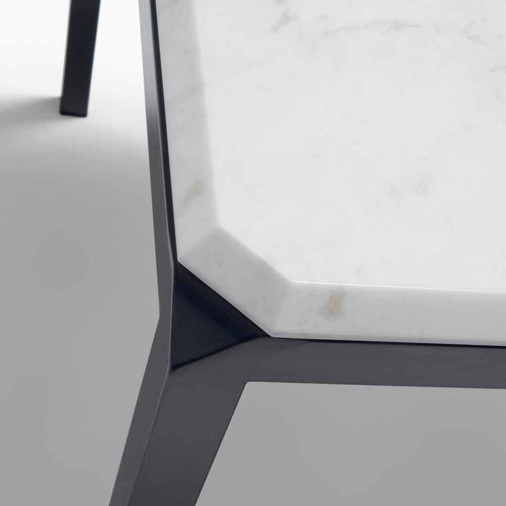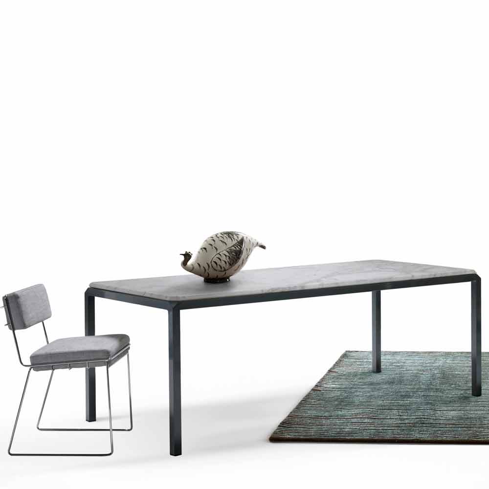 La meticolosa cura del dettaglio, la qualità della lavorazione, il contrasto tra la struttura in ferro e il piano in marmo indentifica il tavolo Bebop.