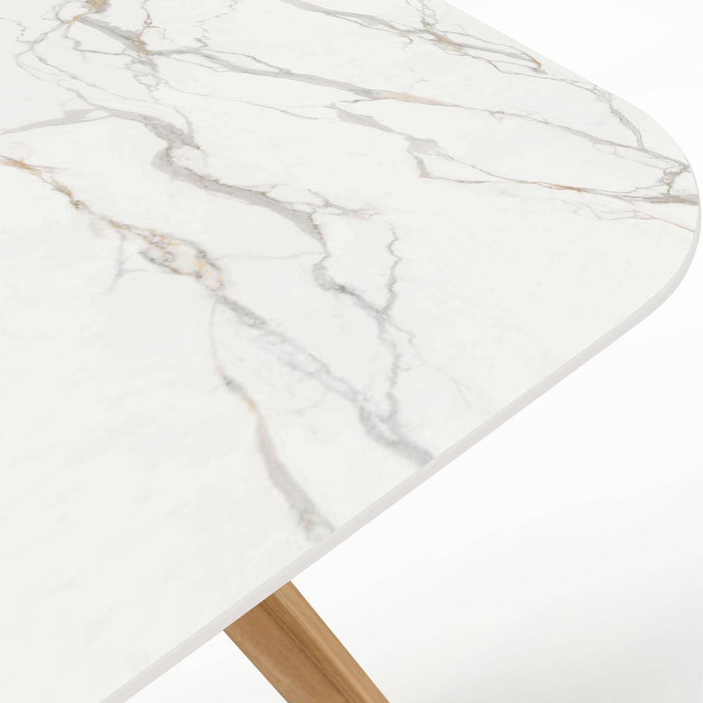 Questo tavolo da esterno con piano in ceramica calacatta oro, è un tributo all'eleganza senza tempo e al lusso sottile. Unisce una base in legno , calda e accogliente, con un piano in ceramica che emula perfettamente il marmo calacatta oro, noto per le sue esclusive venature dorate su sfondo bianco.
