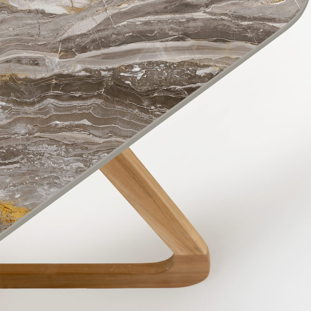 Questo tavolo da esterno è una meraviglia del design che unisce la robustezza del legno a l'opulenza della ceramica ispirata al marmo Orobico Luxe. Questo piano in ceramica, con le sue sfumature di grigio e le scintillanti venature dorate, riflette la bellezza e la complessità delle formazioni rocciose naturali, aggiungendo un tocco di lusso sofisticato allo spazio esterno.