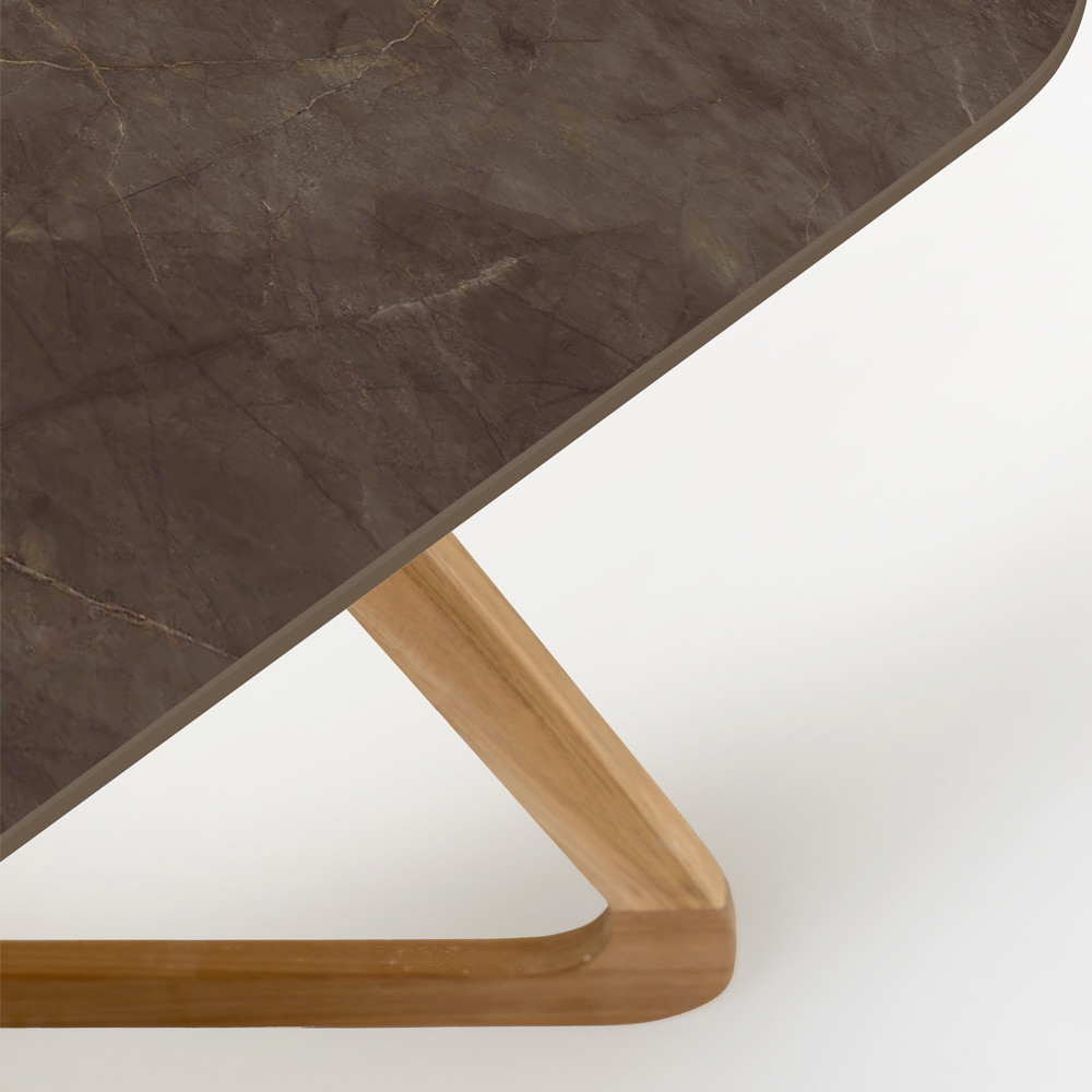 Questo tavolo da esterno con piano in ceramica Pulpis Brown, una scelta di design sofisticata per chi desidera portare un tocco di eleganza terrosa nel proprio spazio all'aperto. Il tavolo combina una base in legno con un piano in ceramica che emula il marmo Pulpis Brown, noto per il suo profondo colore marrone e le sottili venature più chiare che attraversano la superficie.