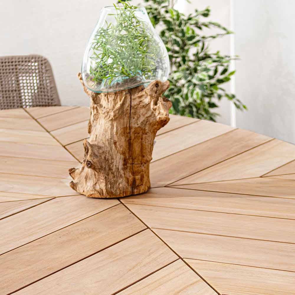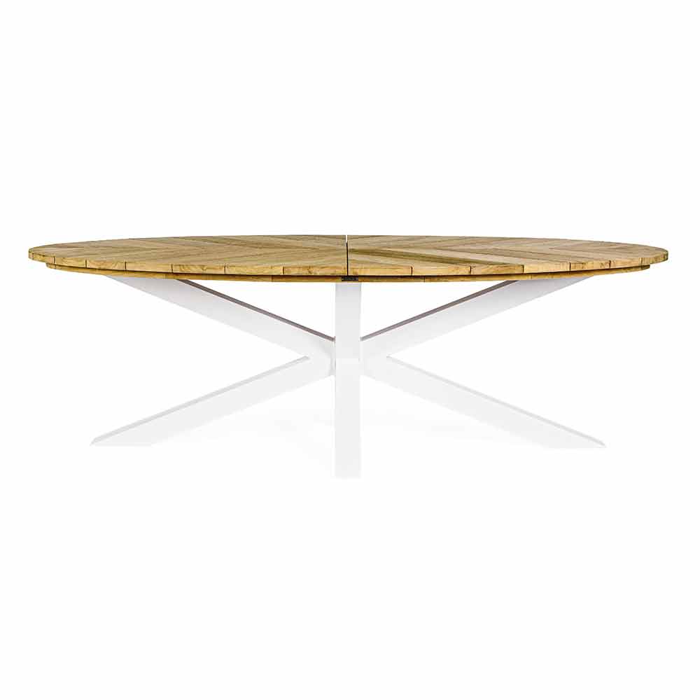 Piano in legno teak (classe A) - SVLK (legno certificato proveniente da foreste sostenibili), gambe in alluminio verniciate a polvere (poliestere). Ferramente in acciaio galvanizzato.
