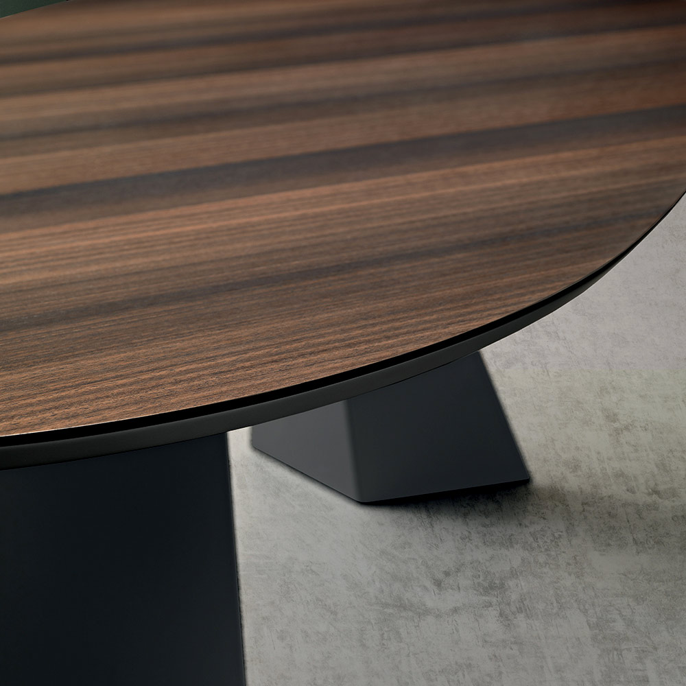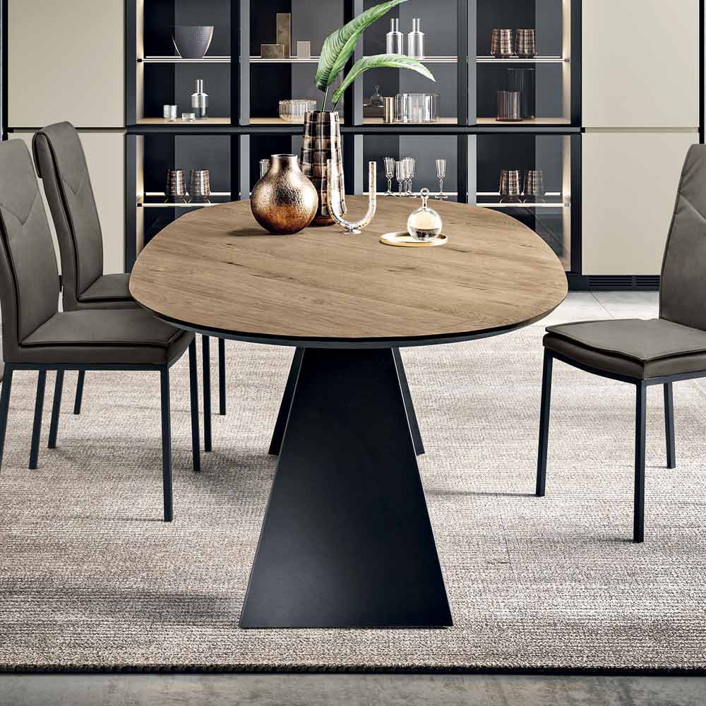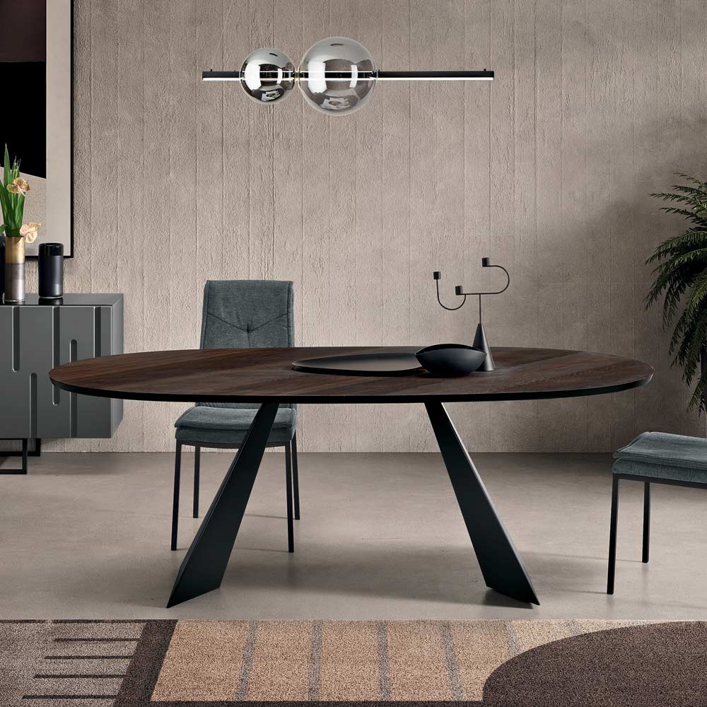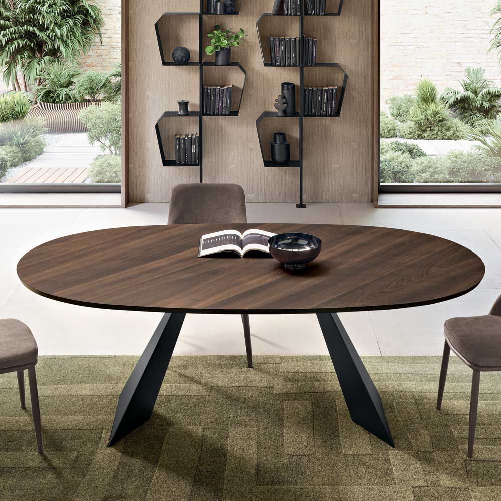 Elegante tavolo da pranzo di design Made in Italy, pensato per arredare con stile la sala da pranzo o la zona living. Il tavolo reinterpreta il design essenziale del modello Gilmour con un raffinato piano ovale in rovere impiallacciato, una scelta che dona morbidezza alle linee e favorisce una convivialità senza spigoli.