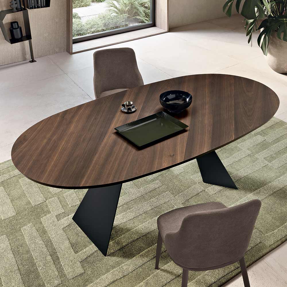 La forma ovale del piano conferisce leggerezza visiva e facilita la disposizione delle sedute attorno al tavolo, rendendolo perfetto per momenti conviviali e per ambienti contemporanei. La superficie in legno esalta il calore naturale del materiale, creando un equilibrio tra eleganza e comfort visivo.