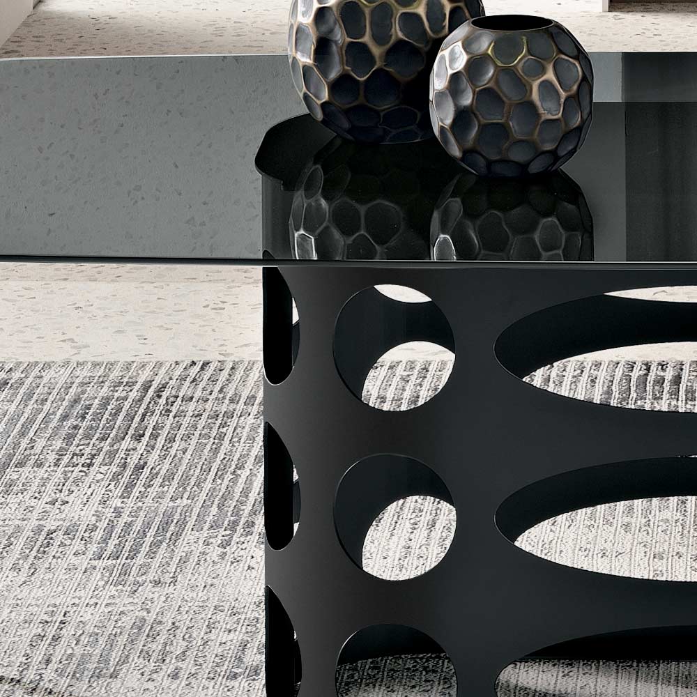 Il piano in vetro liscio fumè dona luminosità e leggerezza visiva alla struttura, valorizzando il design contemporaneo del tavolo. La trasparenza del vetro permette di mettere in risalto la base decorativa, trasformandola in un vero elemento di design capace di catturare lo sguardo.