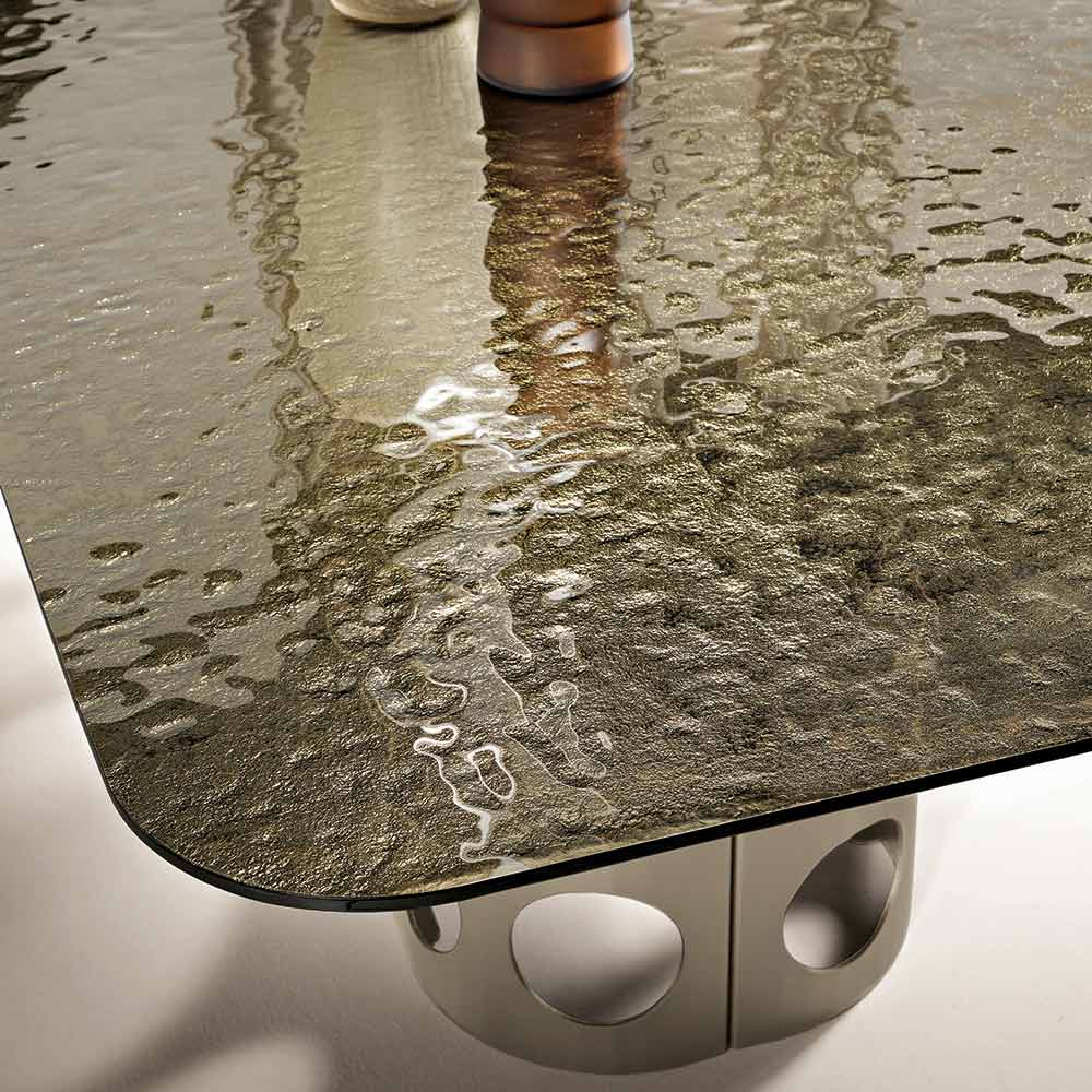 Il piano in vetro martellato dona profondità e personalità al tavolo grazie alla sua particolare texture materica che riflette la luce in modo irregolare, creando suggestivi effetti visivi. Questa lavorazione rende ogni superficie dinamica e raffinata, valorizzando il design contemporaneo del prodotto.