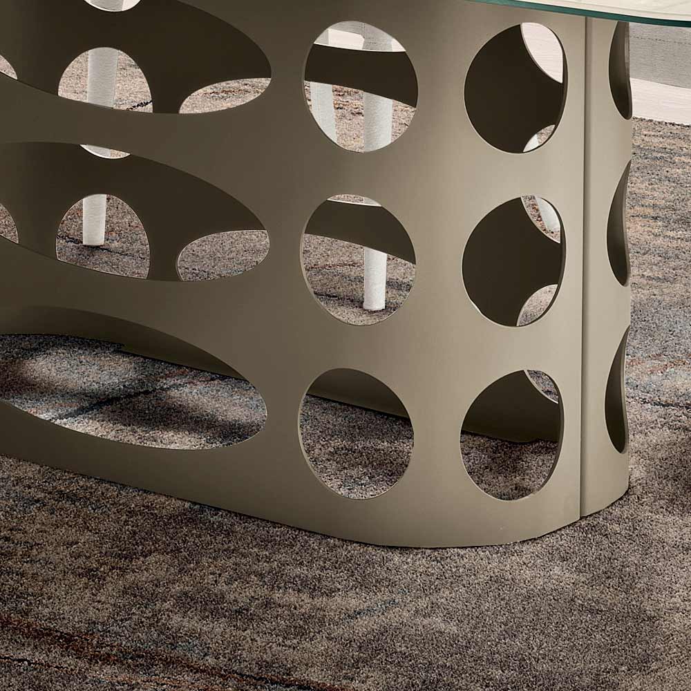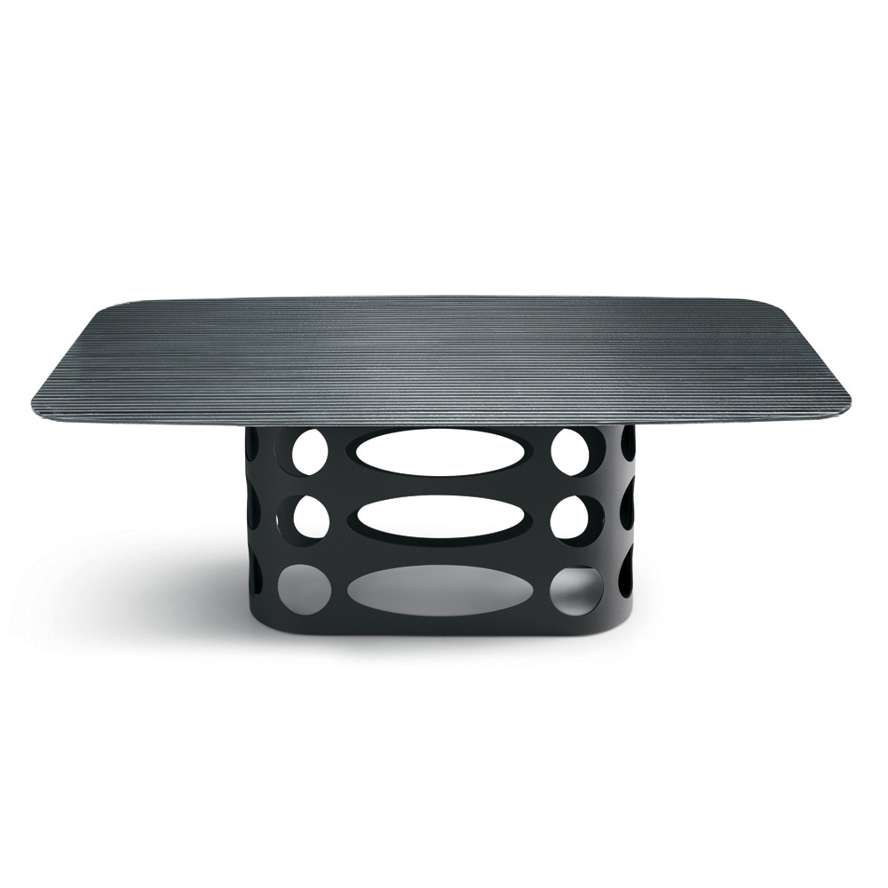 Raffinato tavolo da pranzo di design Made in Italy, ideale per arredare con stile la sala da pranzo o la zona living. Il tavolo si distingue per il suo originale basamento in metallo verniciato, caratterizzato da eleganti trafori ellittici e circolari che creano un suggestivo gioco grafico di pieni e vuoti, conferendo alla struttura un forte carattere decorativo.
