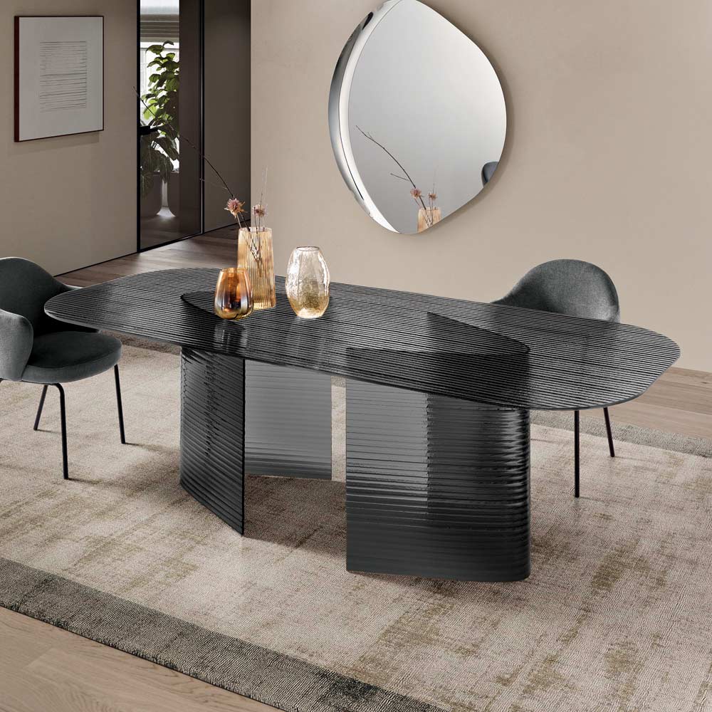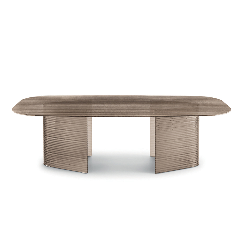 Il particolare basamento composto da due elementi curvi crea una struttura scultorea e dinamica che diventa il vero protagonista del tavolo. La trasparenza del vetro valorizza il design e mantiene gli spazi visivamente leggeri, rendendolo perfetto per ambienti moderni ed eleganti.