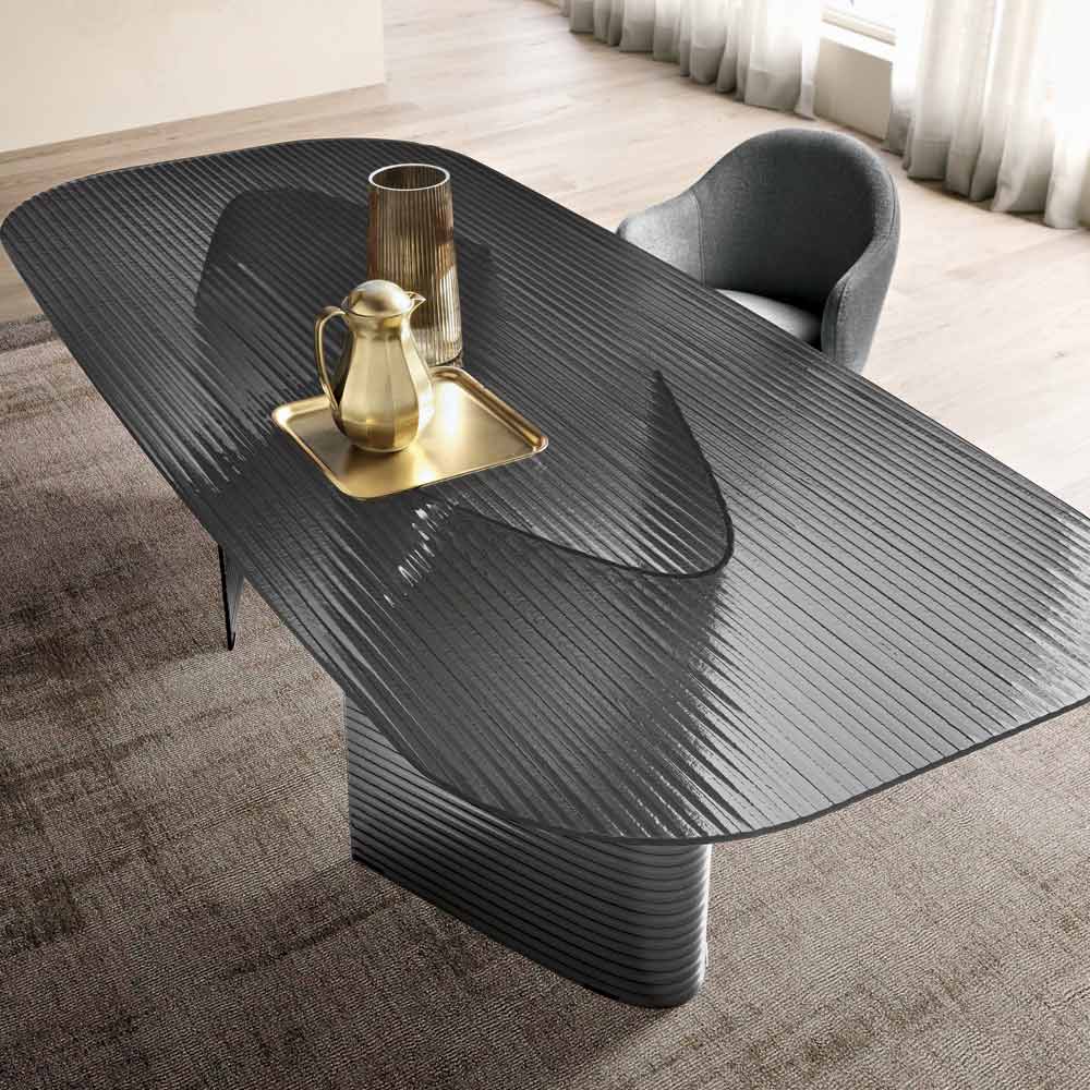 Elegante tavolo da pranzo di design Made in Italy caratterizzato da uno stile raffinato e contemporaneo, ideale per arredare con personalità la sala da pranzo o la zona living. Realizzato interamente in vetro rigato trasparente, questo tavolo dona luminosità all’ambiente creando affascinanti giochi di luce e riflessi.