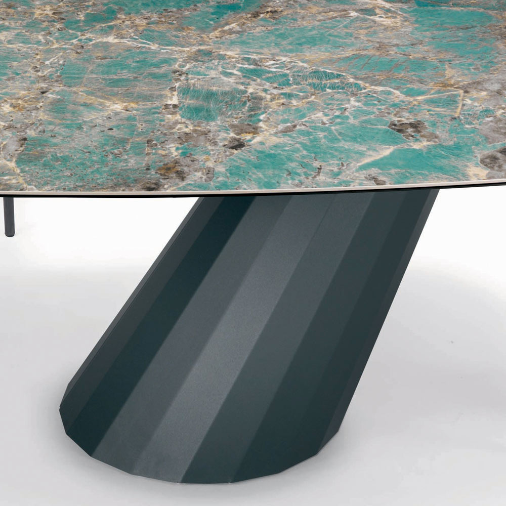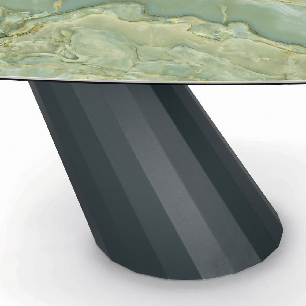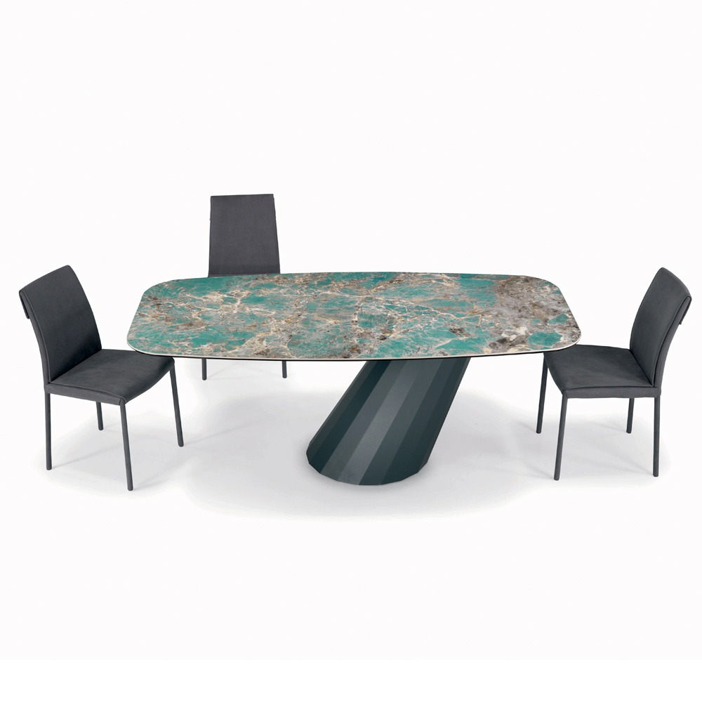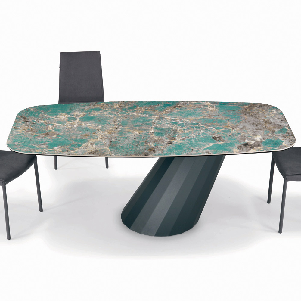 ricercatezza della forma del basamento unita alla finitura del piano che si sceglie crea un tavolo unico, dal grande impatto visivo che arreda con