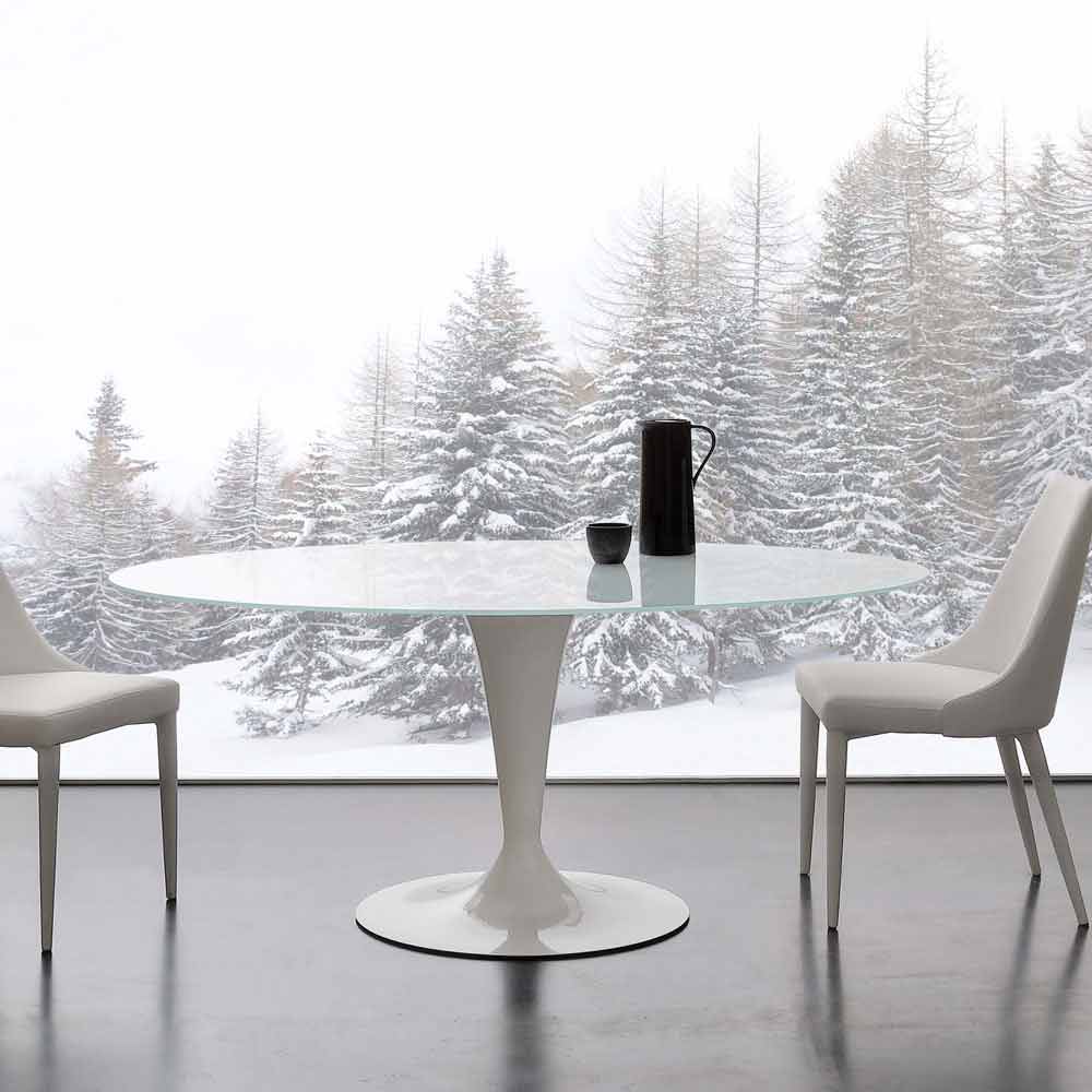 Questo tavolo è realizzato da una gamba in acciaio nella finitura verniciata bianca, completo di un piano in vetro temperato extrawhite dalla forma originale ellittica (10 mm).