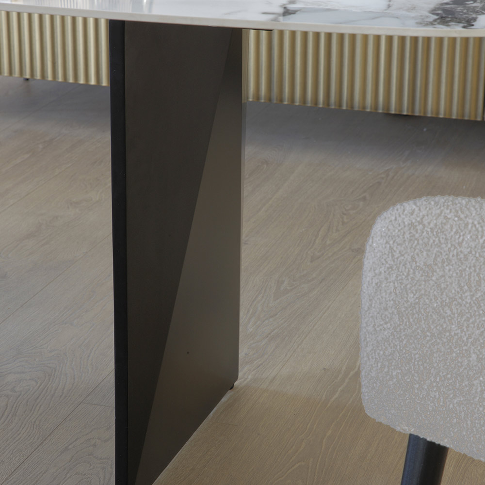 La base in metallo verniciato presenta un design geometrico minimal ma d’impatto, con gambe a lama che garantiscono stabilità e leggerezza visiva. Questo contrasto tra la solidità della struttura e l’eleganza del top crea un effetto armonioso e moderno.