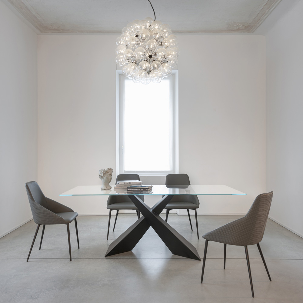 Il piano in vetro temperato trasparente dona leggerezza visiva e rende il tavolo perfetto per valorizzare ogni tipo di ambiente, dal più classico al più contemporaneo.