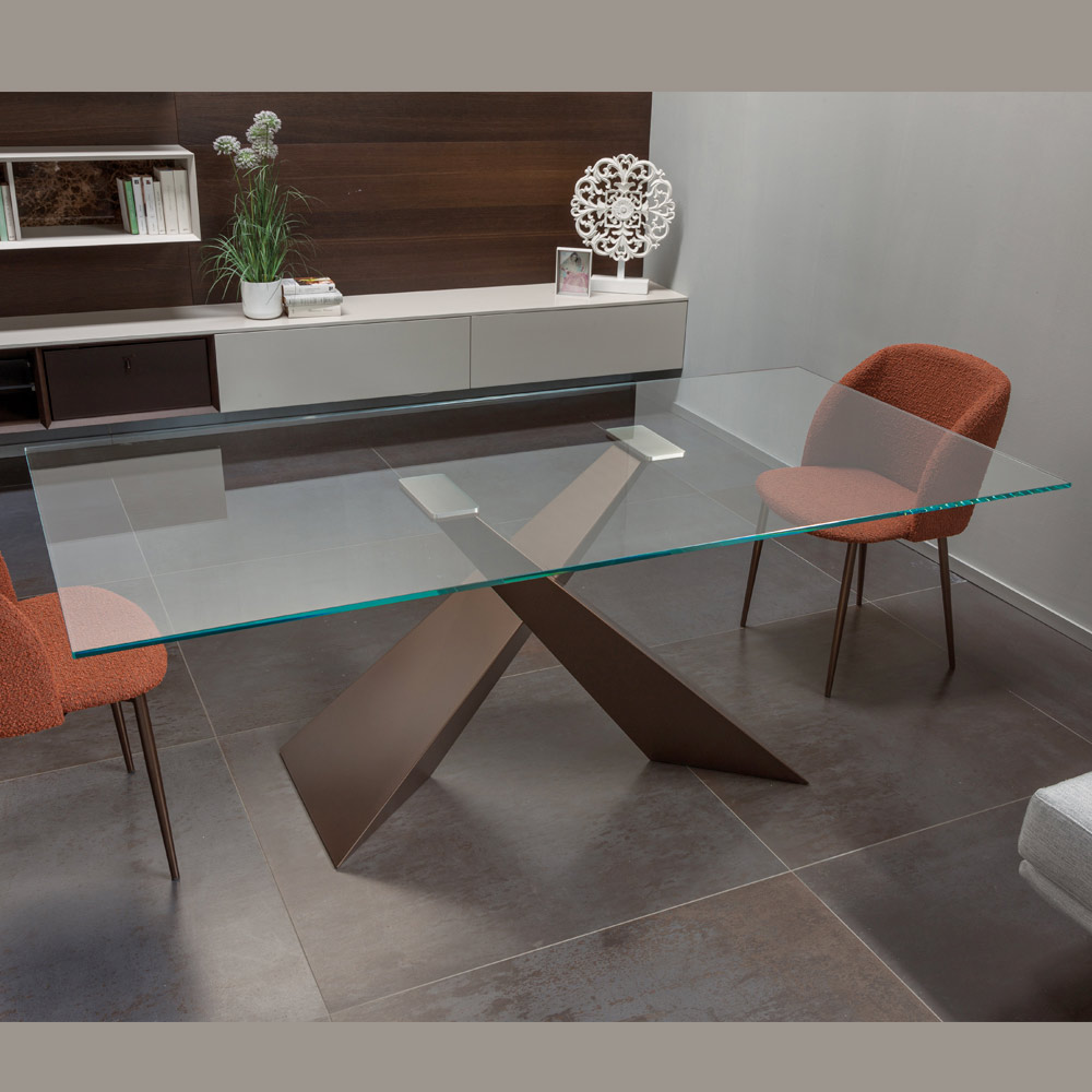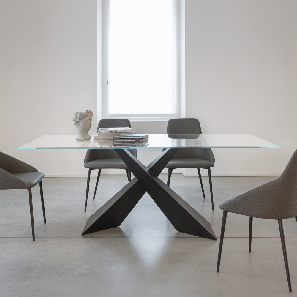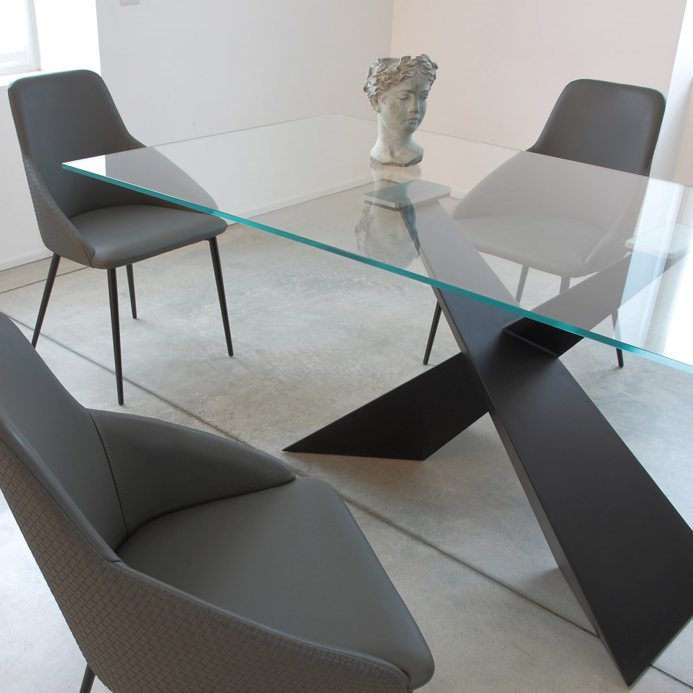 Il protagonista assoluto è la base incrociata in metallo verniciato, dal design geometrico e dinamico. Le linee decise creano un effetto scultoreo e architettonico, trasformando il tavolo in un vero e proprio elemento d’arredo.