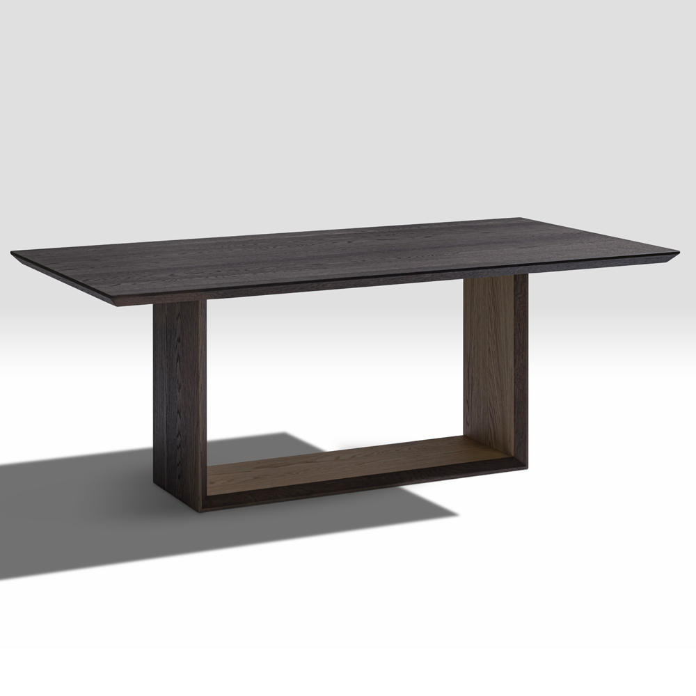 Tavolo fisso con piano bisellato rovere fumo e basamento bicolore Made in Italy.
