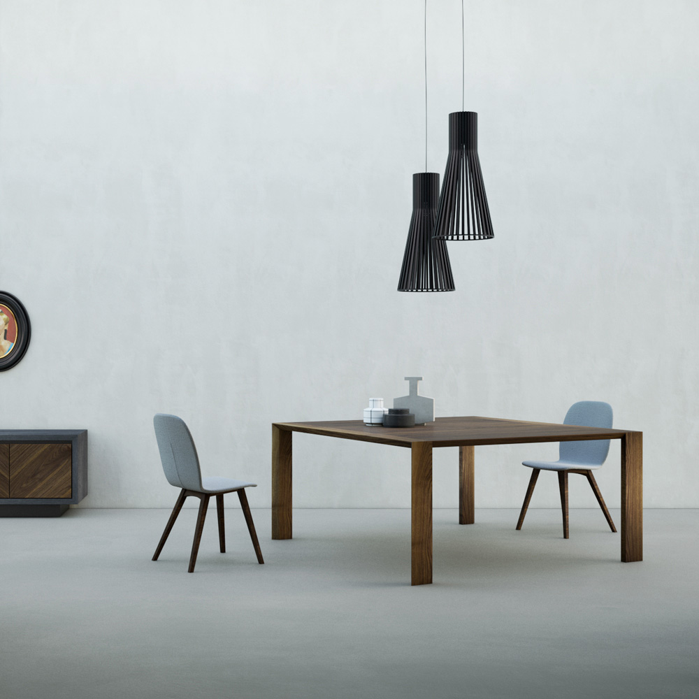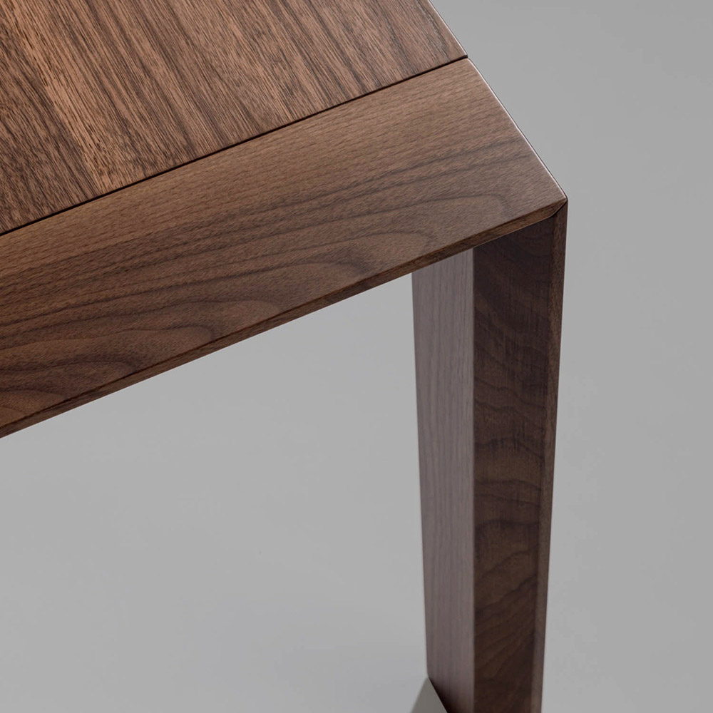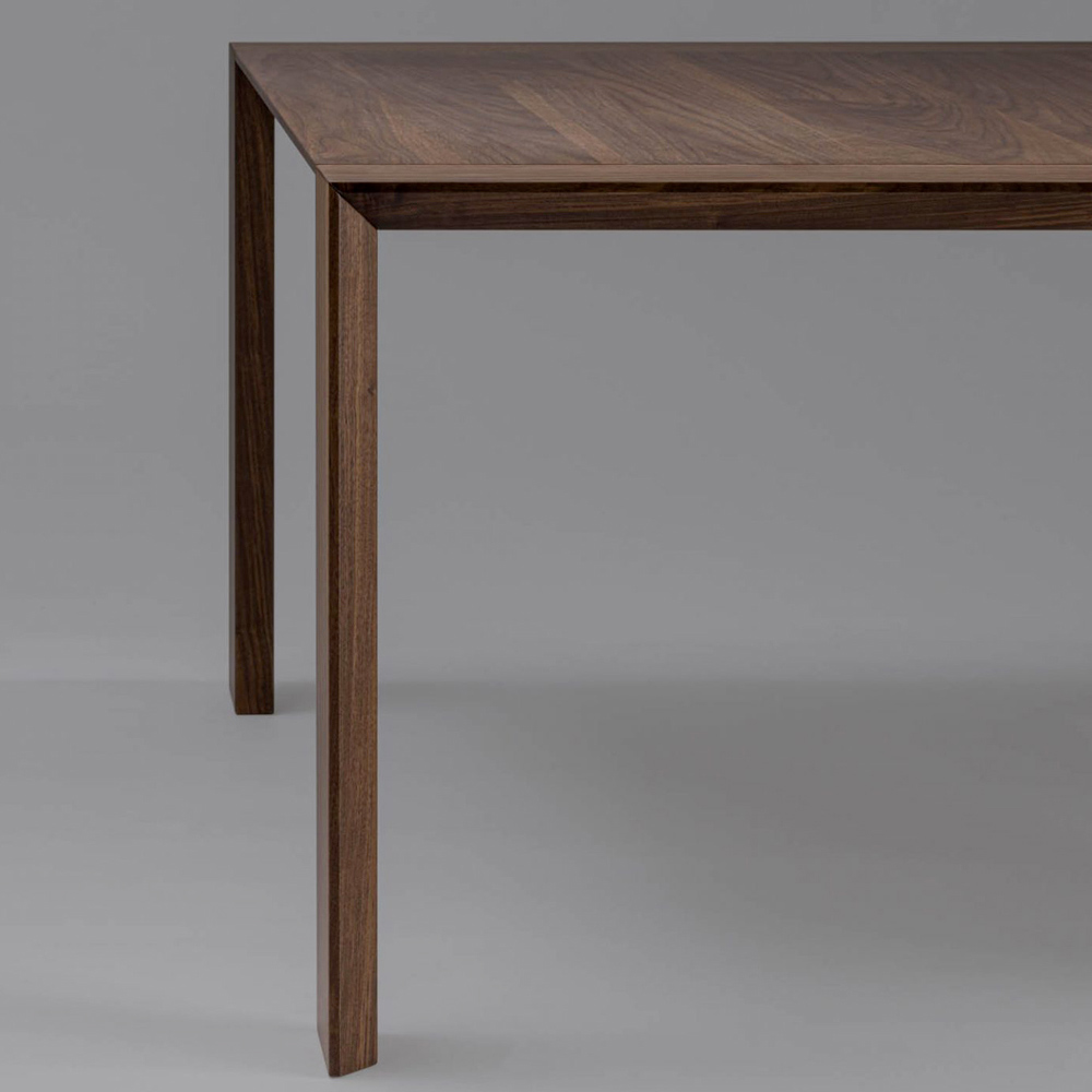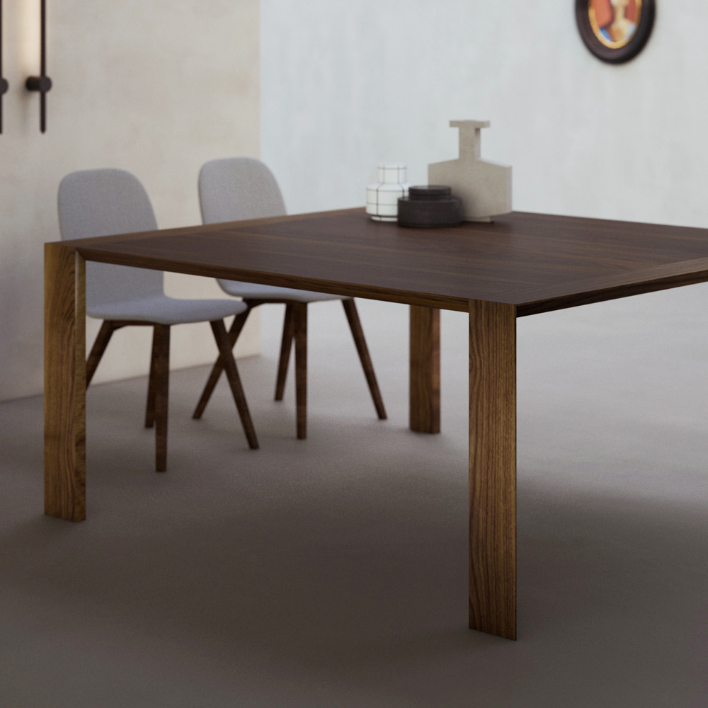 Tavolo fisso con gambe bisellate impiallacciate su lamellare e piano impiallacciato su truciolare di pioppo color noce canaletto.