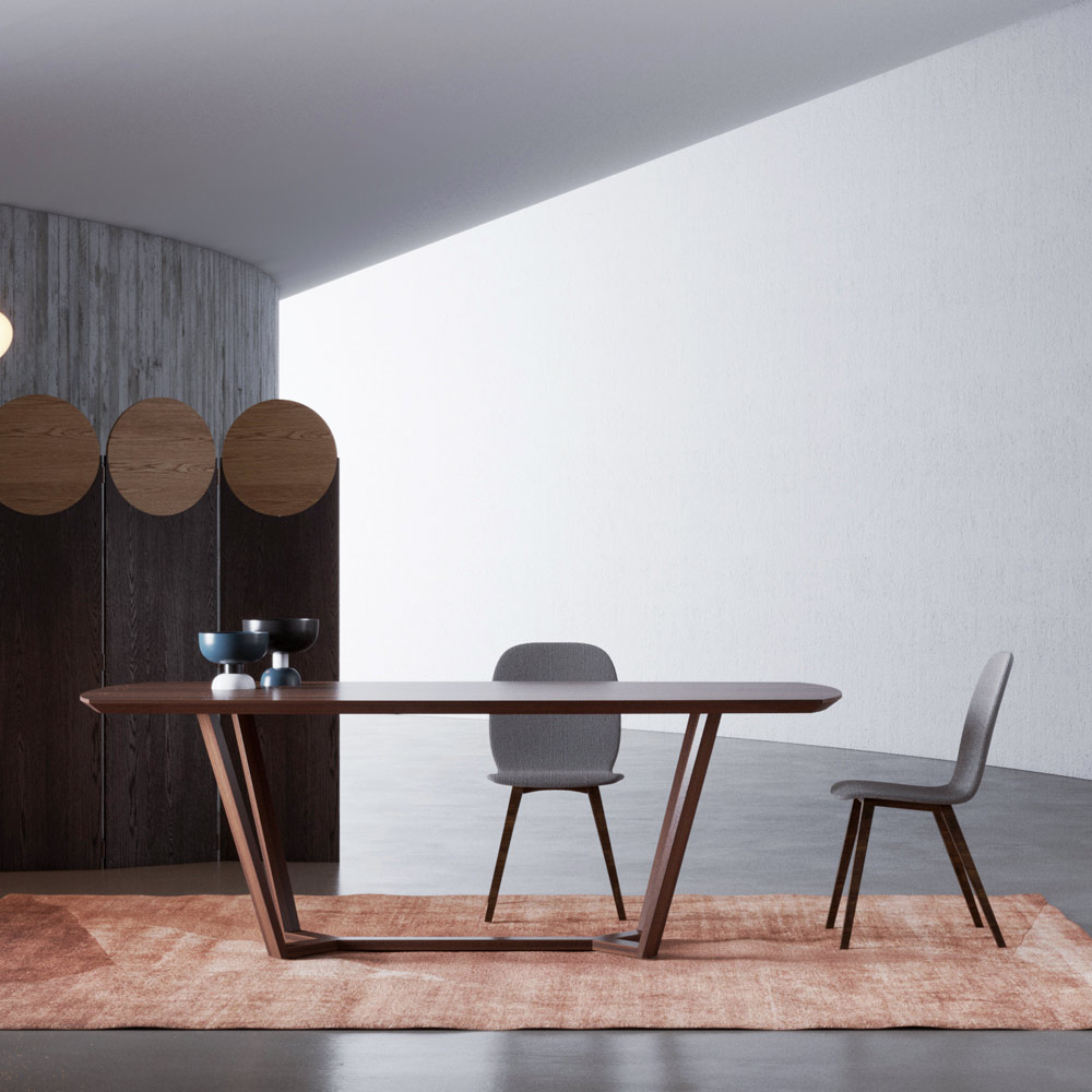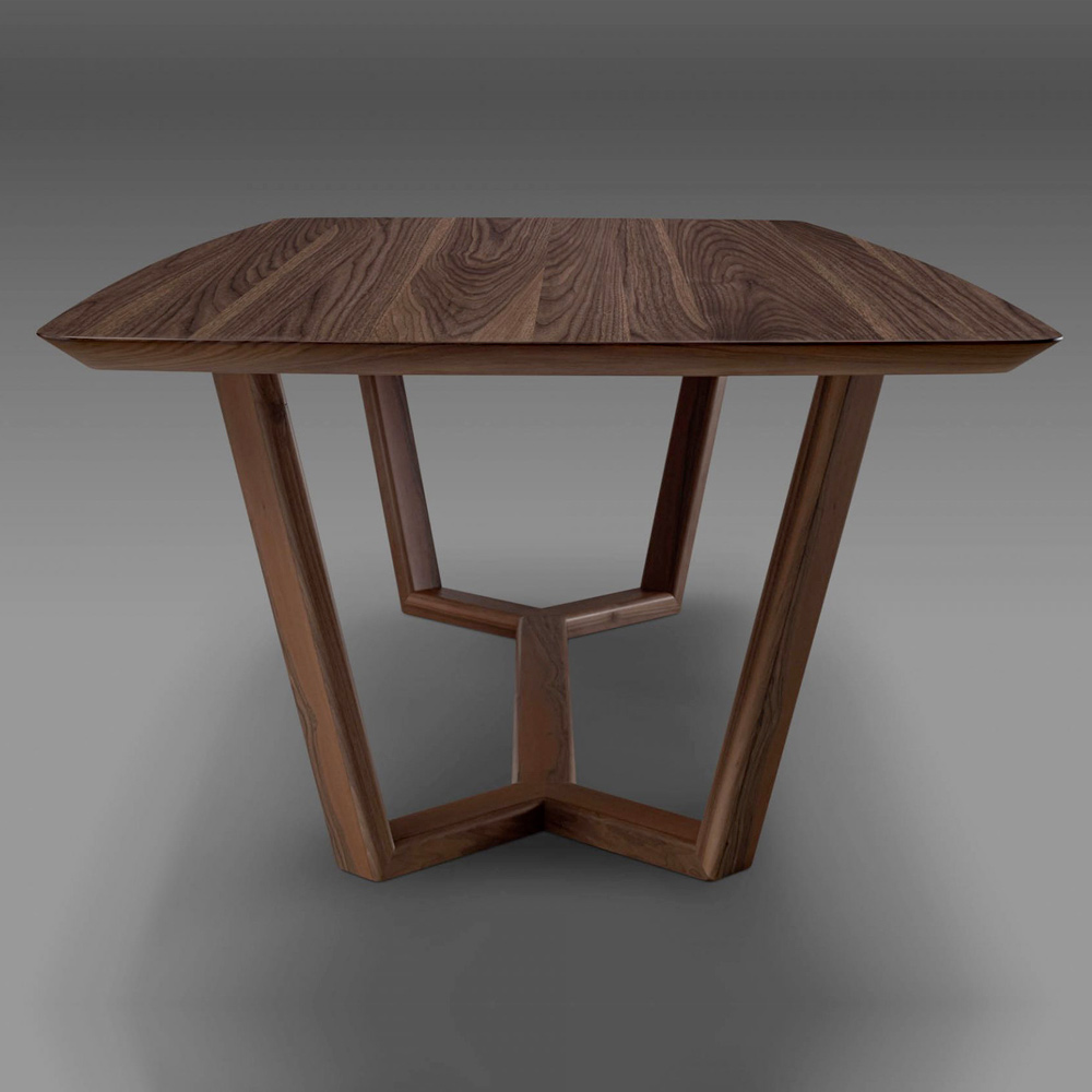 Tavolo fisso con piano sagomato bisellato e basamento in legno massello Made in Italy.