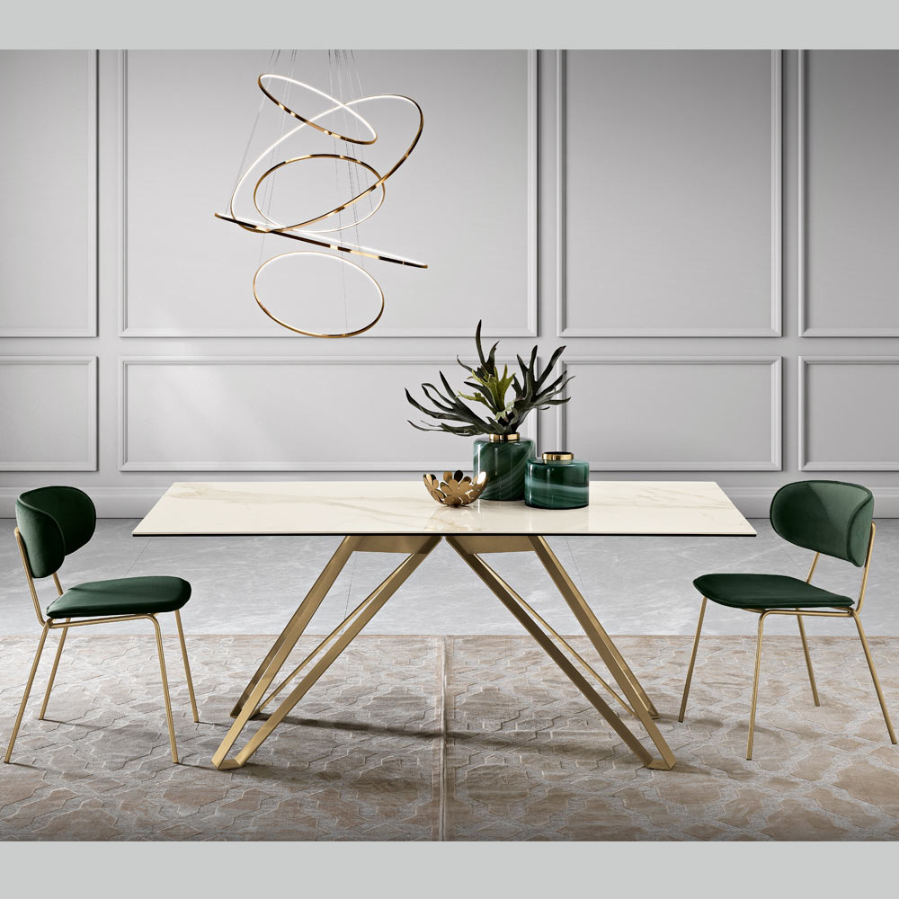 Splendido nel suo contrasto di materiali e colore, questo tavolo è una vera espressione di lusso e design moderno. Il piano in vetroceramica effetto marmo calacatta con sfumature delicate è una celebrazione di eleganza naturale, resistente e al tempo stesso estremamente raffinato.