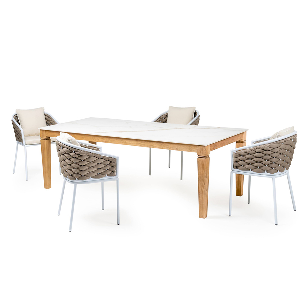 Composizione di tavolo in teak con 4 sedie in teak, intreccio e tessuto
