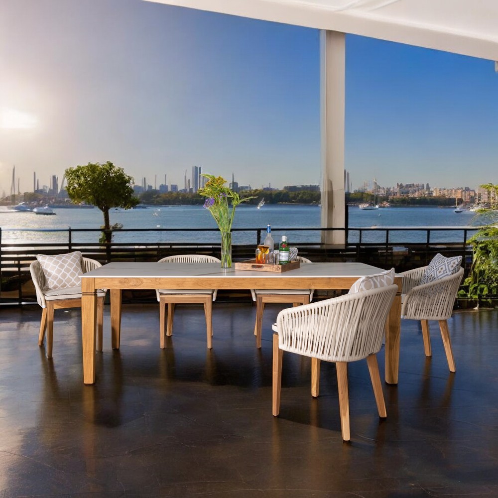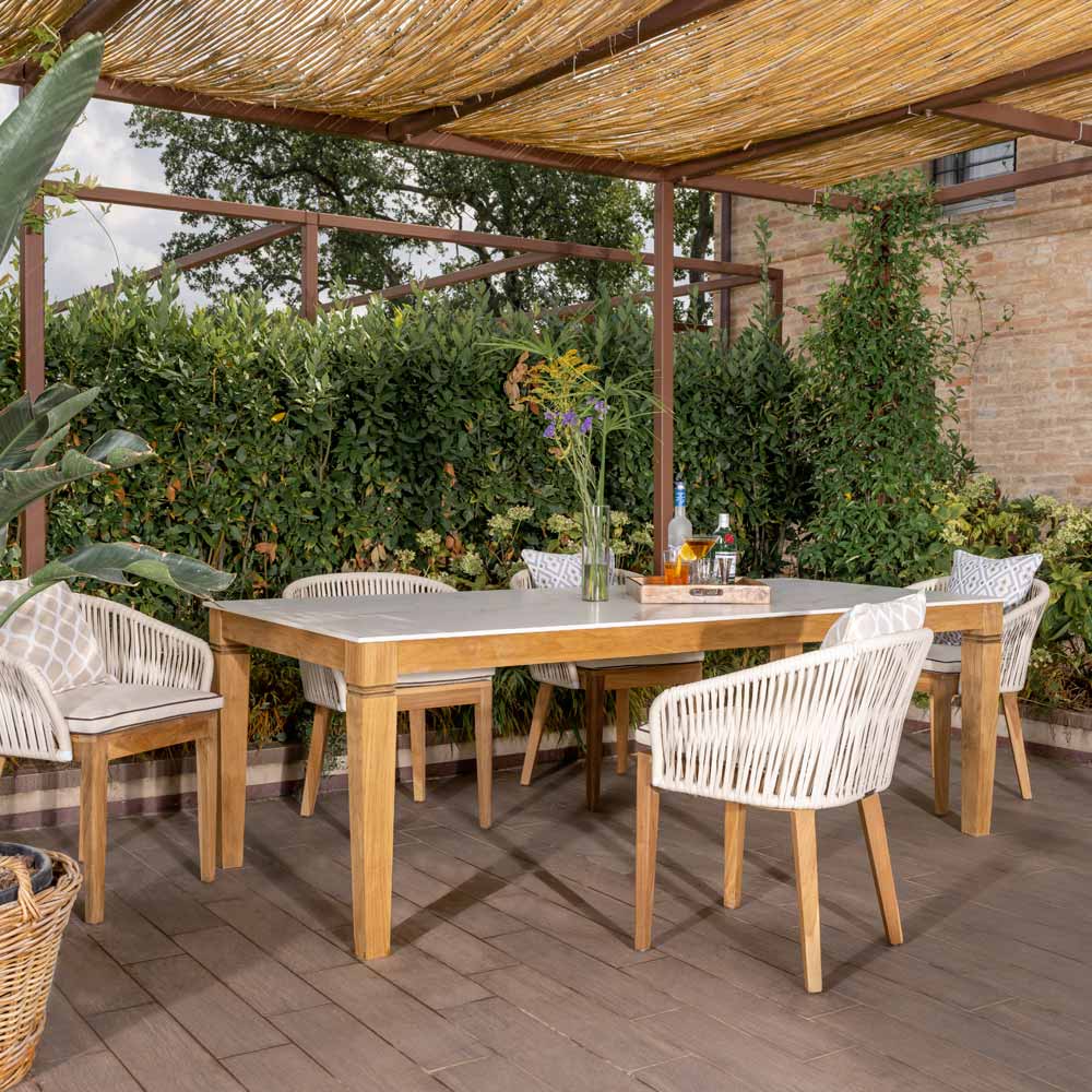 Tavolo da esterno in legno teak naturale e piano in ceramica .