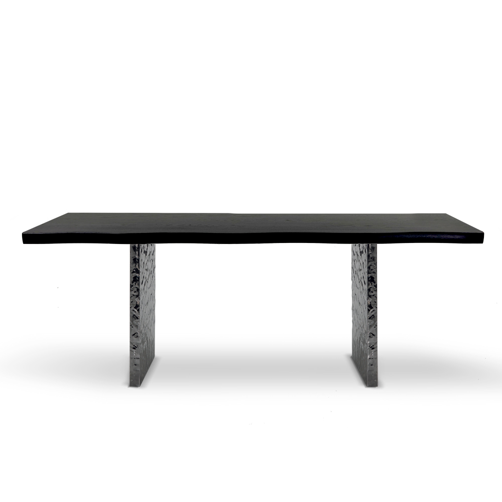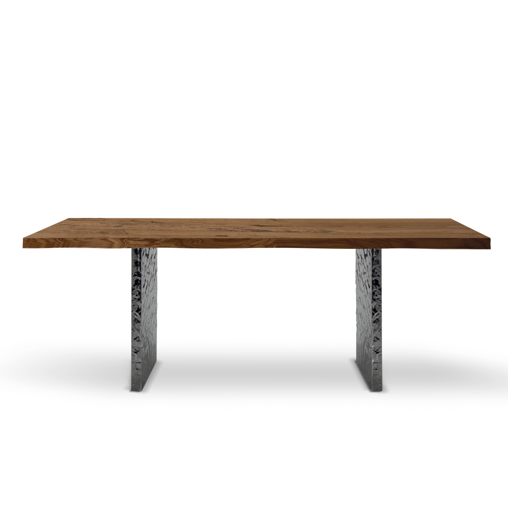 Tavolo di design con piano in legno impiallacciato e base in acciaio martellato prodotto artigianalmente in Italia.