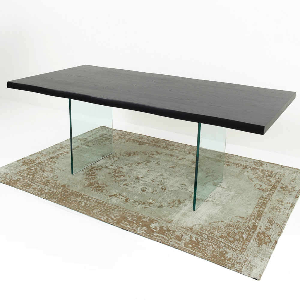Tavolo moderno da pranzo con piano in legno impiallacciato e base in vetro trasparente made in Italy.