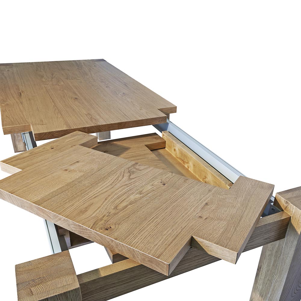 Tavolo living allungabile in placcato di rovere nodato Made in Italy.