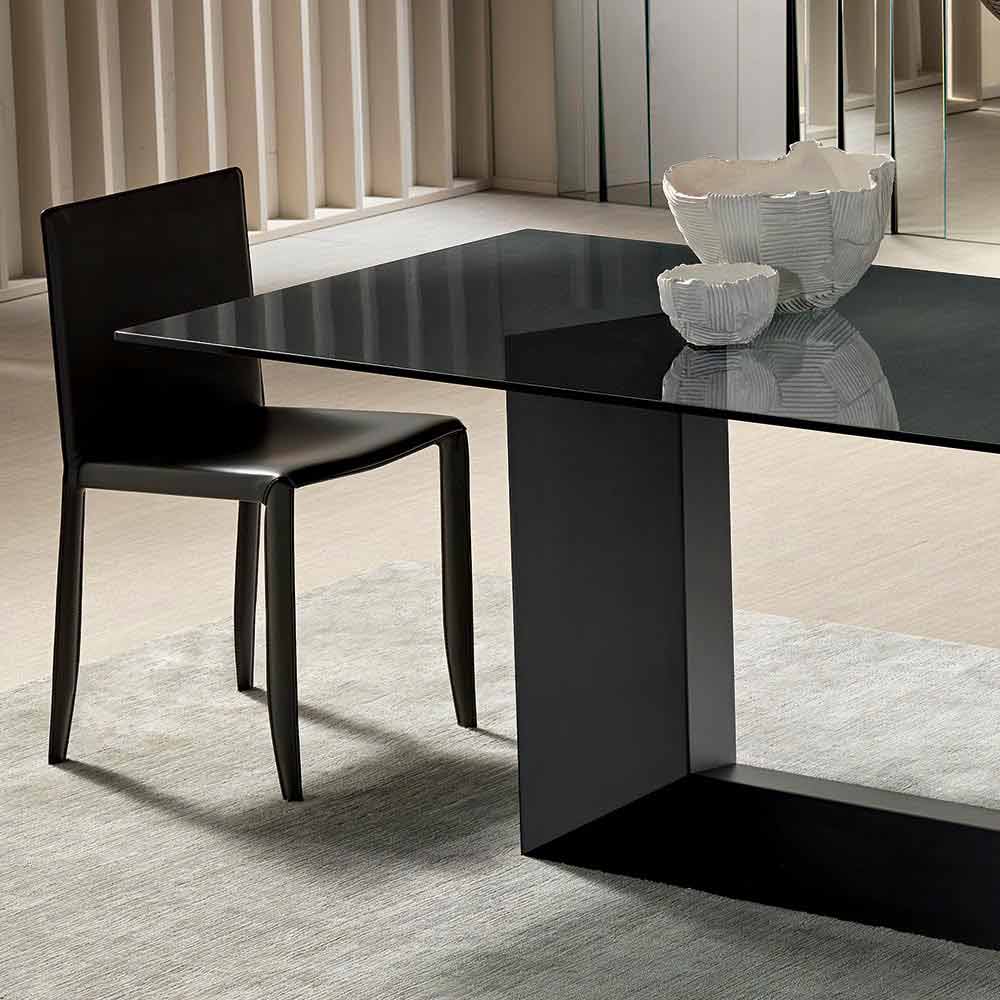 Tavolo di lusso con piano in vetro fumè o extrachiaro e base in metallo nero grafite opaco, prodotto in Italia.