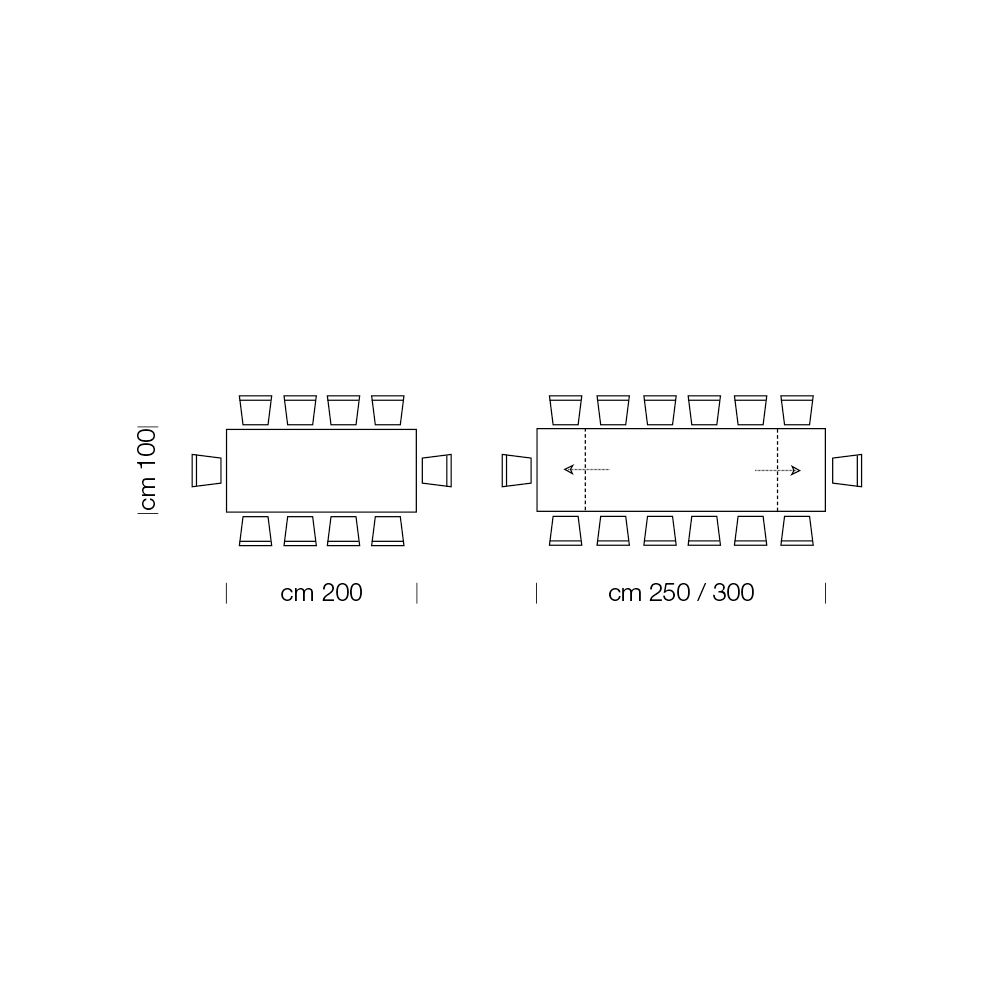 - L 200 (300) x P 100 x H 76,5 cm 14 posti allungabile con 2 allunghe da 50 cm esterne.