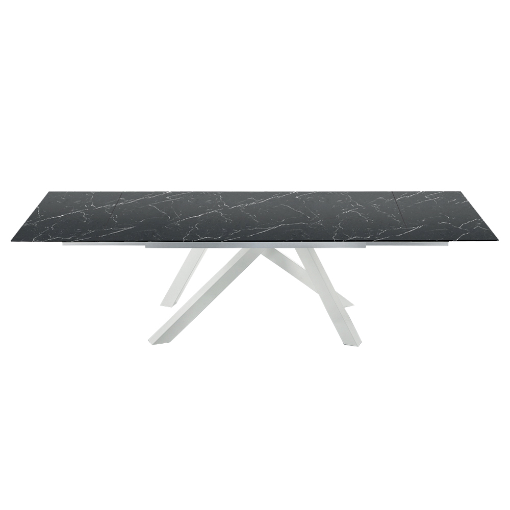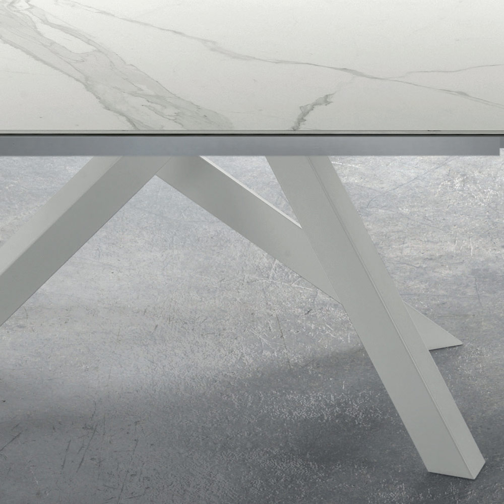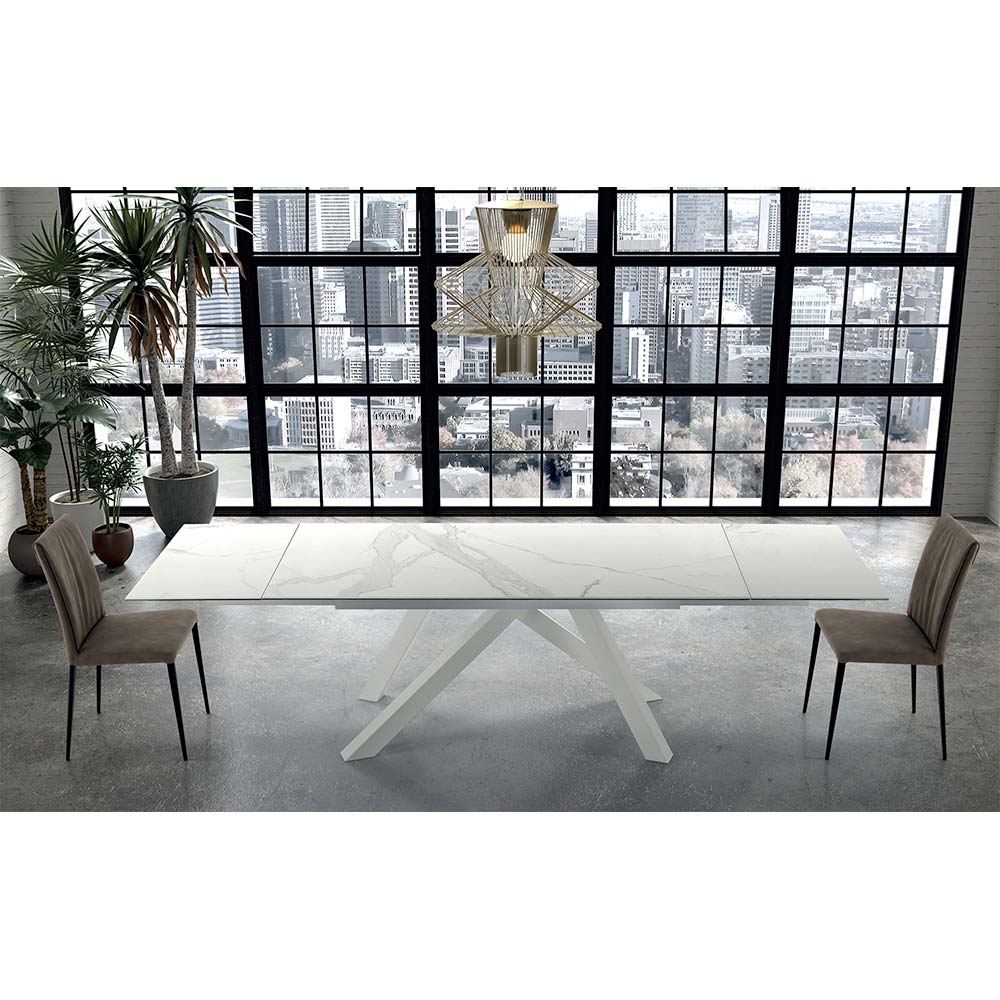 Tavolo in Laminam allungabile fino a 278 cm con base in acciaio bianco o grafite, prodotto in Italia.