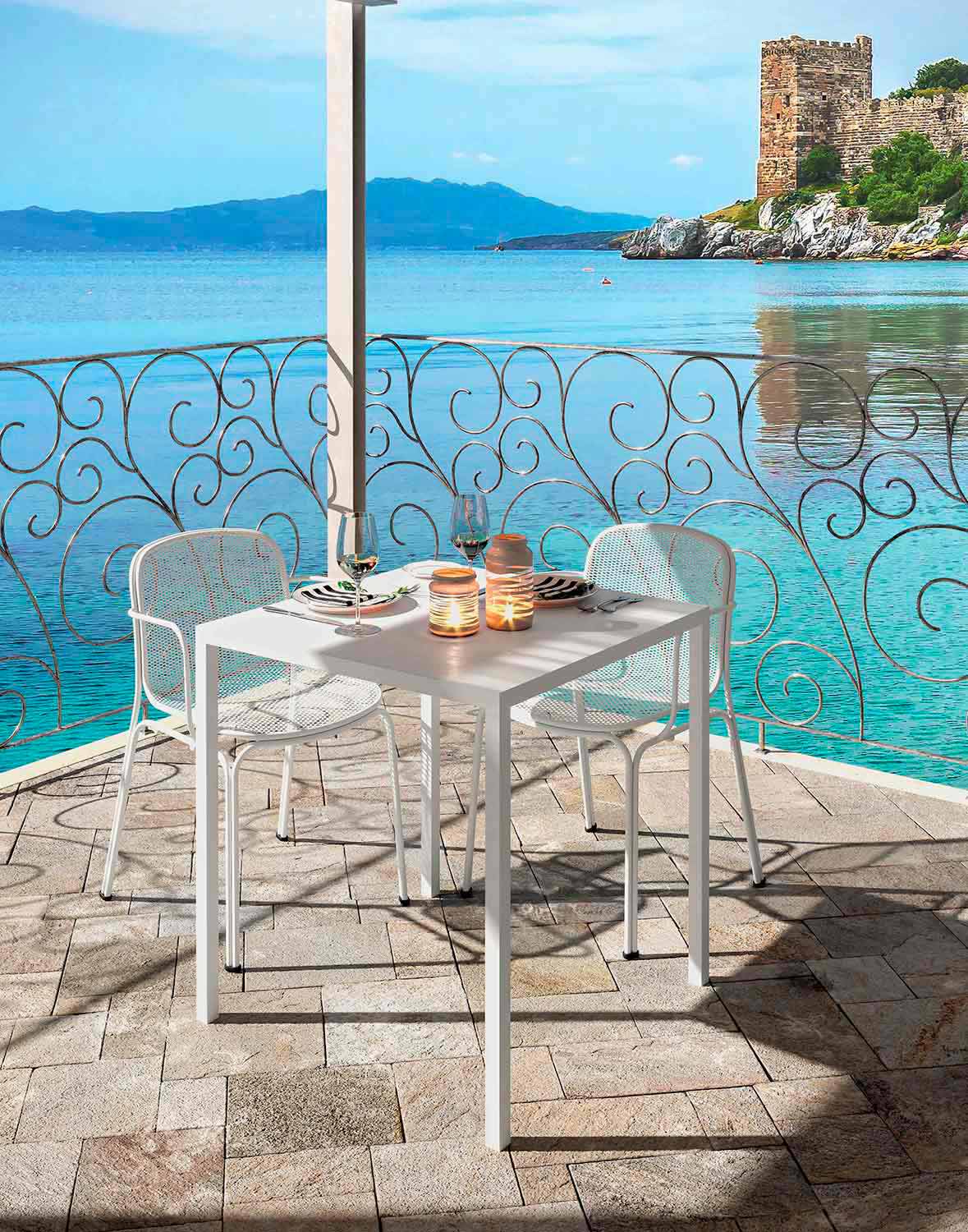 Tavolo moderno quadrato da esterno in lamiera di design Made in Italy.